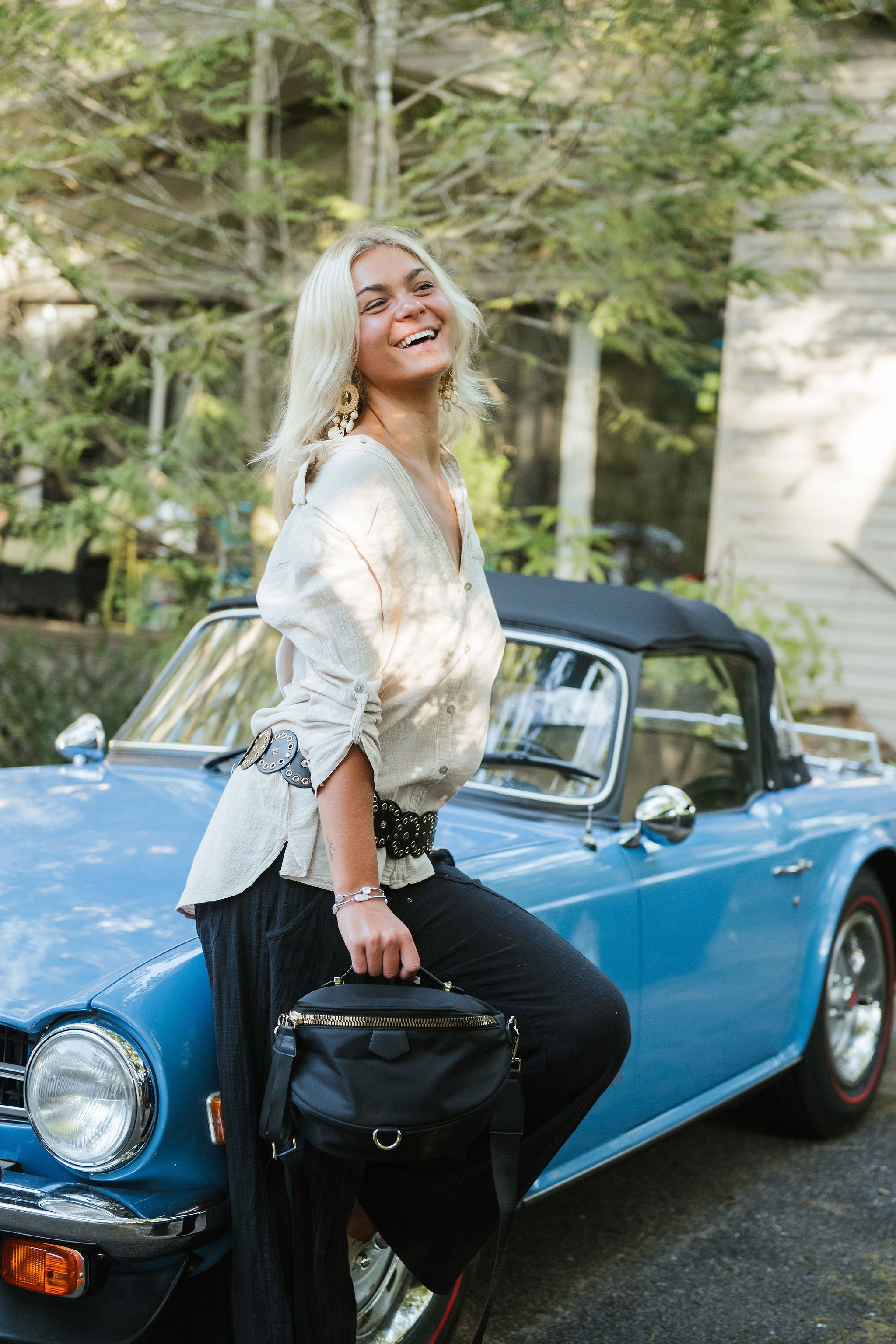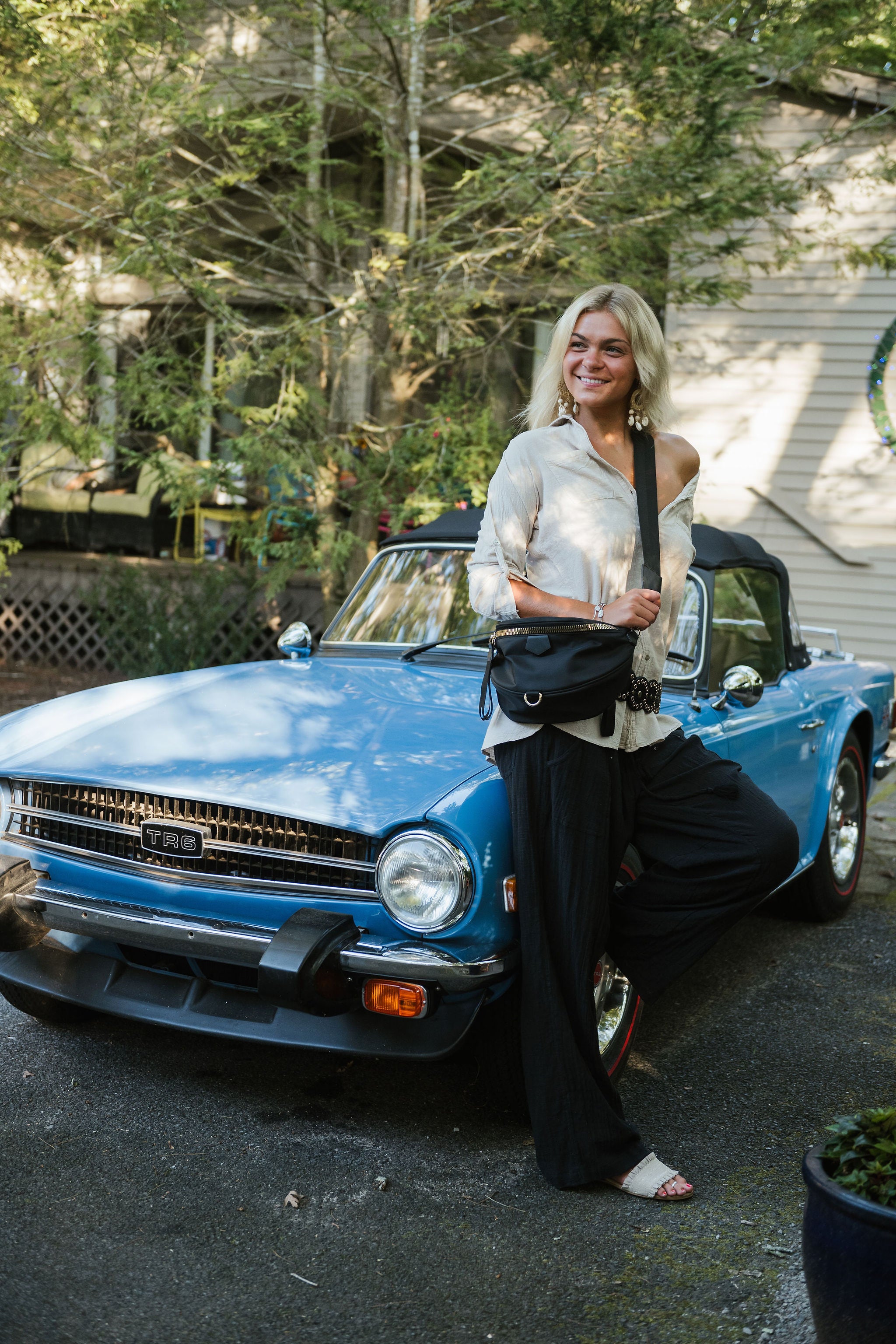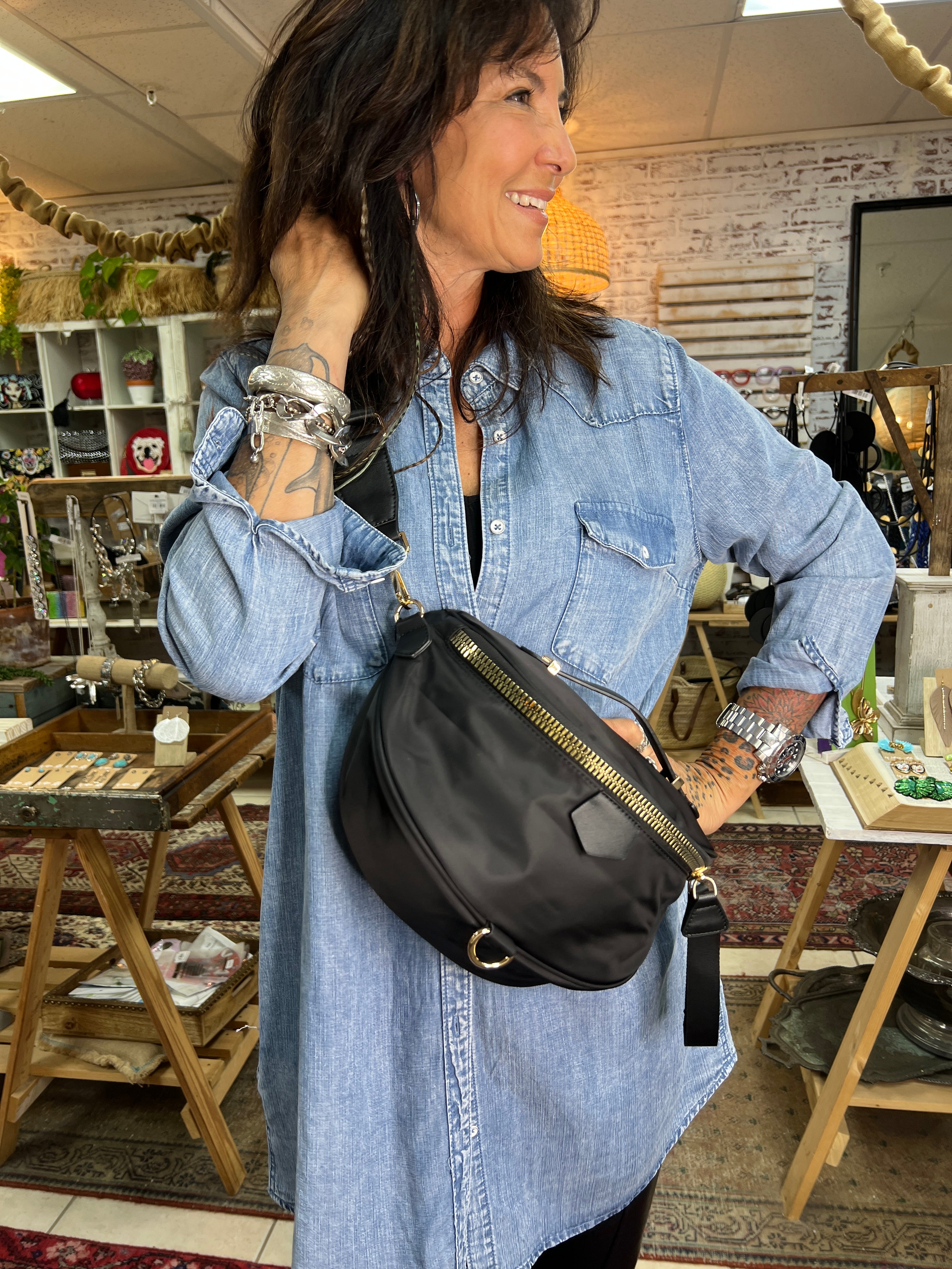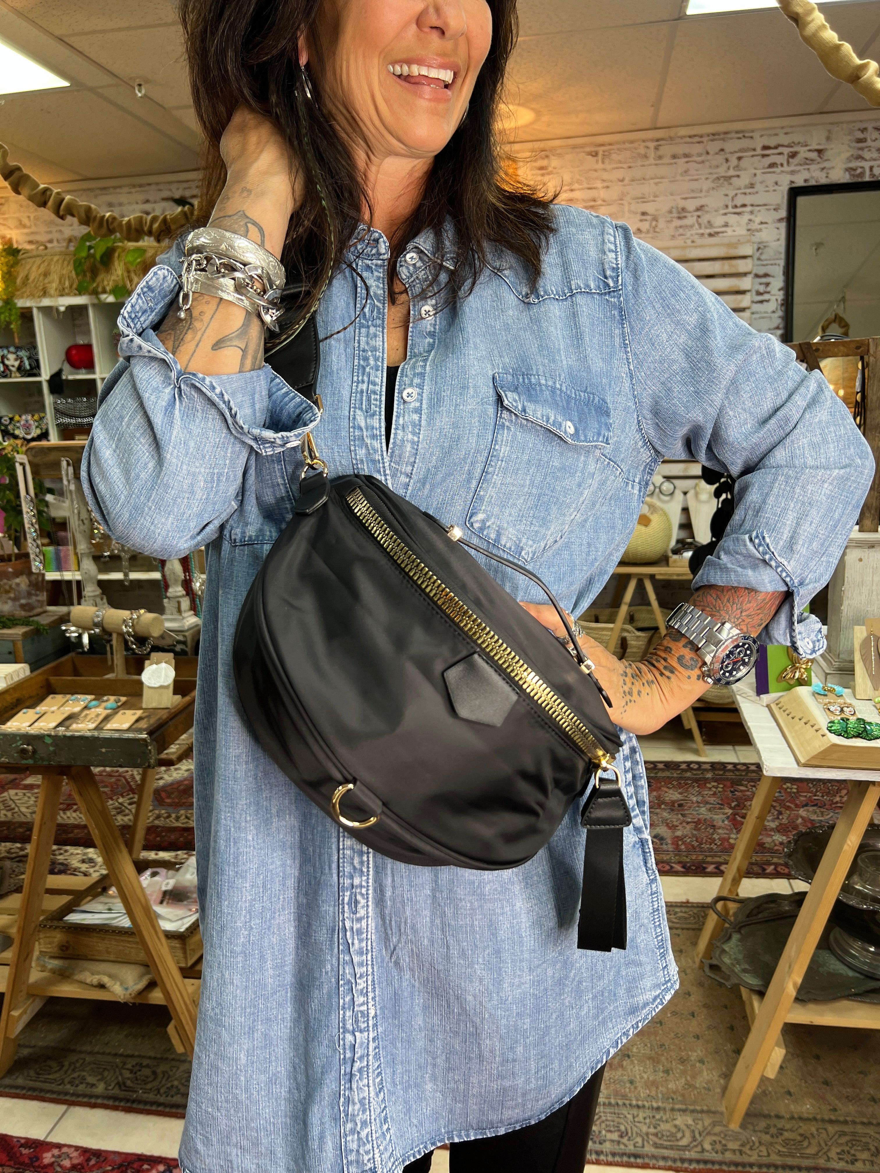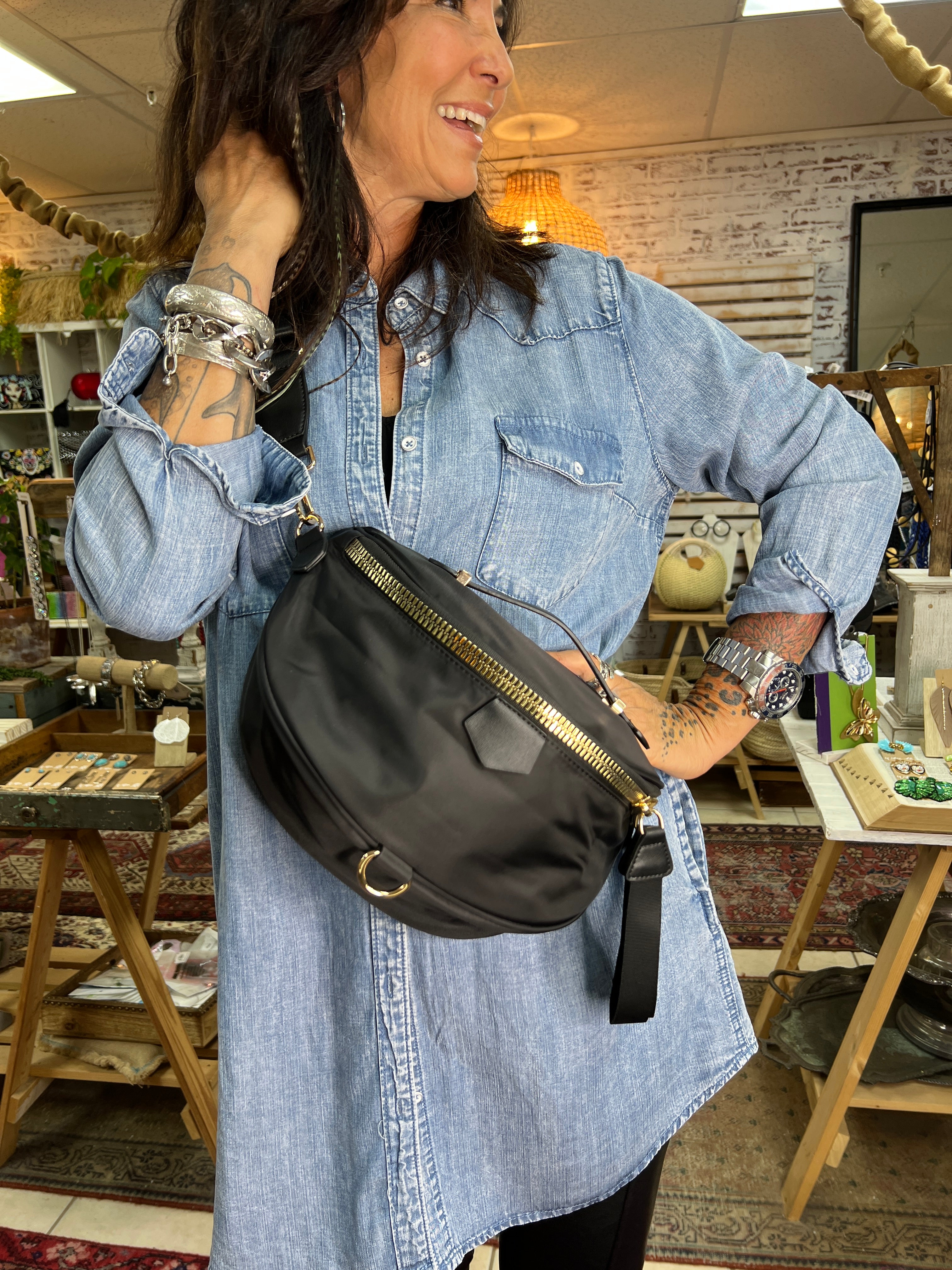Great strap that is perfectly adjustable as a crossbody to a fanny pack. Fits all the larger phones, and so much in the front pouch that opens nice and wide. Top handle, and back zipper, a great place to store your keys and quick reachable essentials.