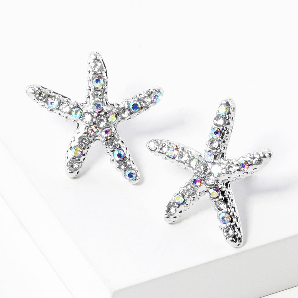 These crystal starfish stud earrings feature clear AB crystals set in rhodium, measuring 3/4" wide. Perfectly capturing the oceanic theme, they offer a refined and elegant accessory choice.