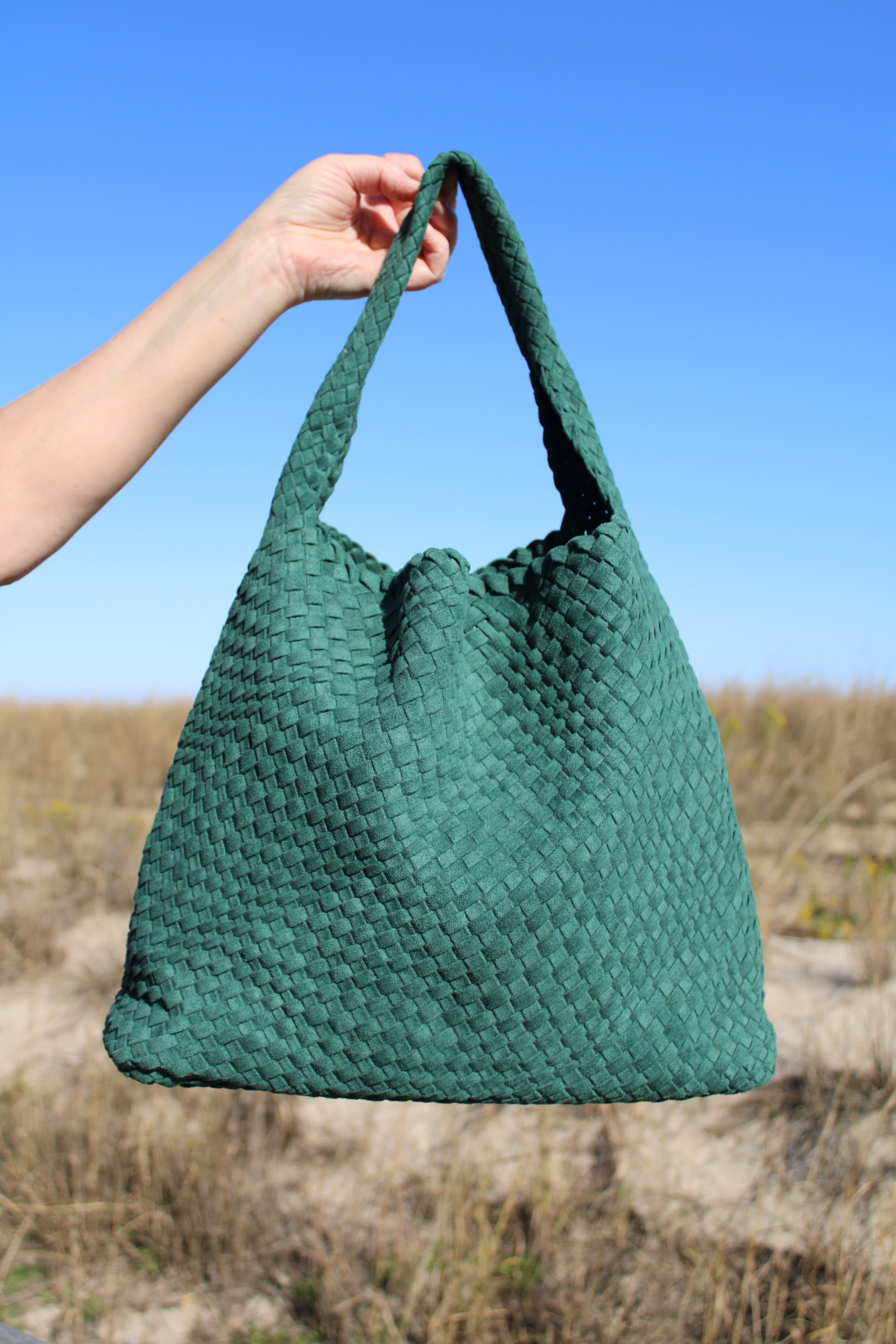 Crafted from premium vegan suede, this basketweave bag combines artisanal construction with modern sustainability.