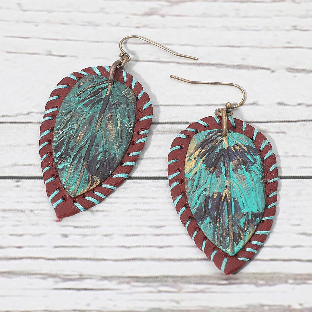 • Artistic drop earrings featuring a textured leaf design framed with a stitched accent edge, offering a handcrafted and expressive look. Perfect for adding a touch of boho-inspired charm and creative flair to both casual and elevated outfits.