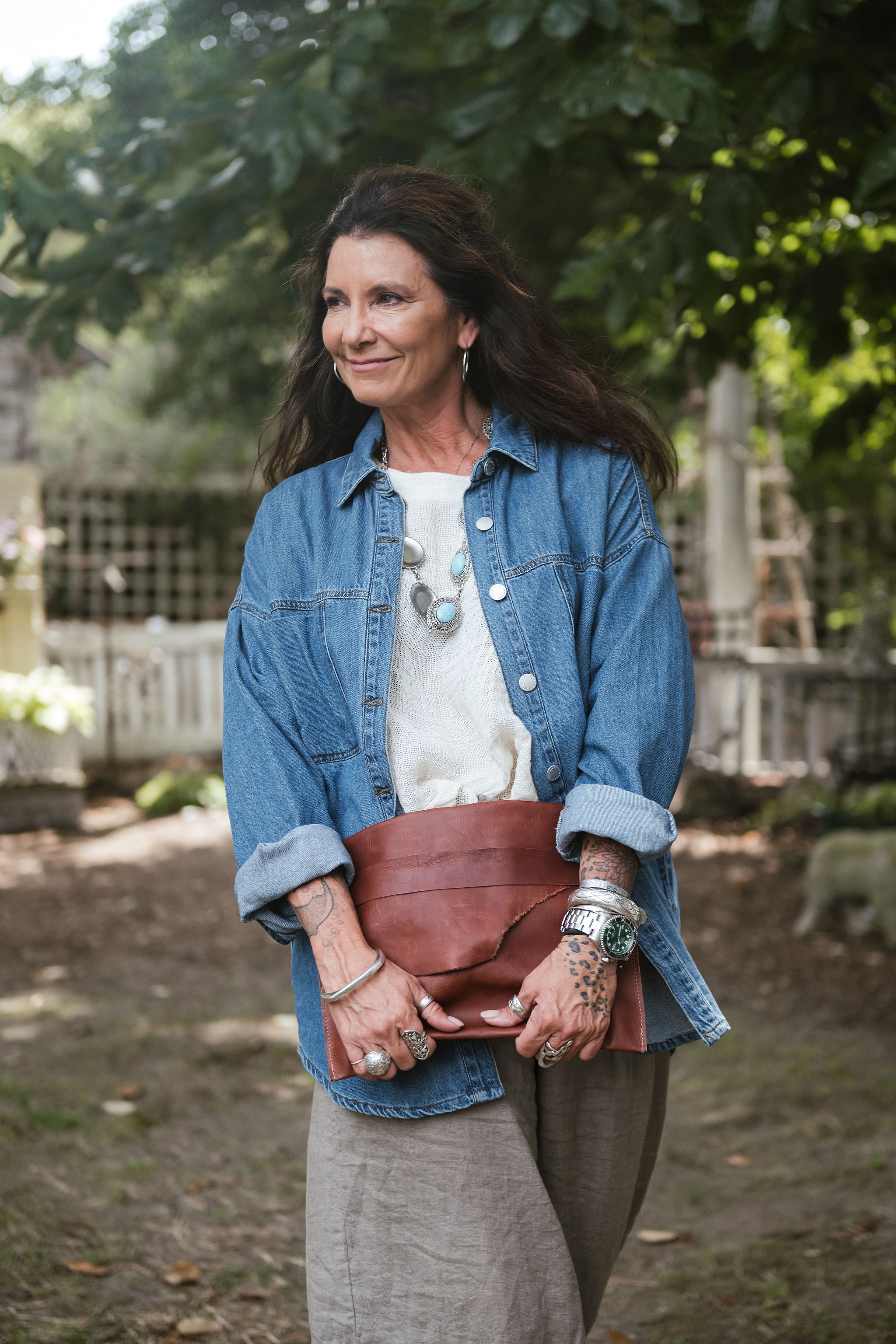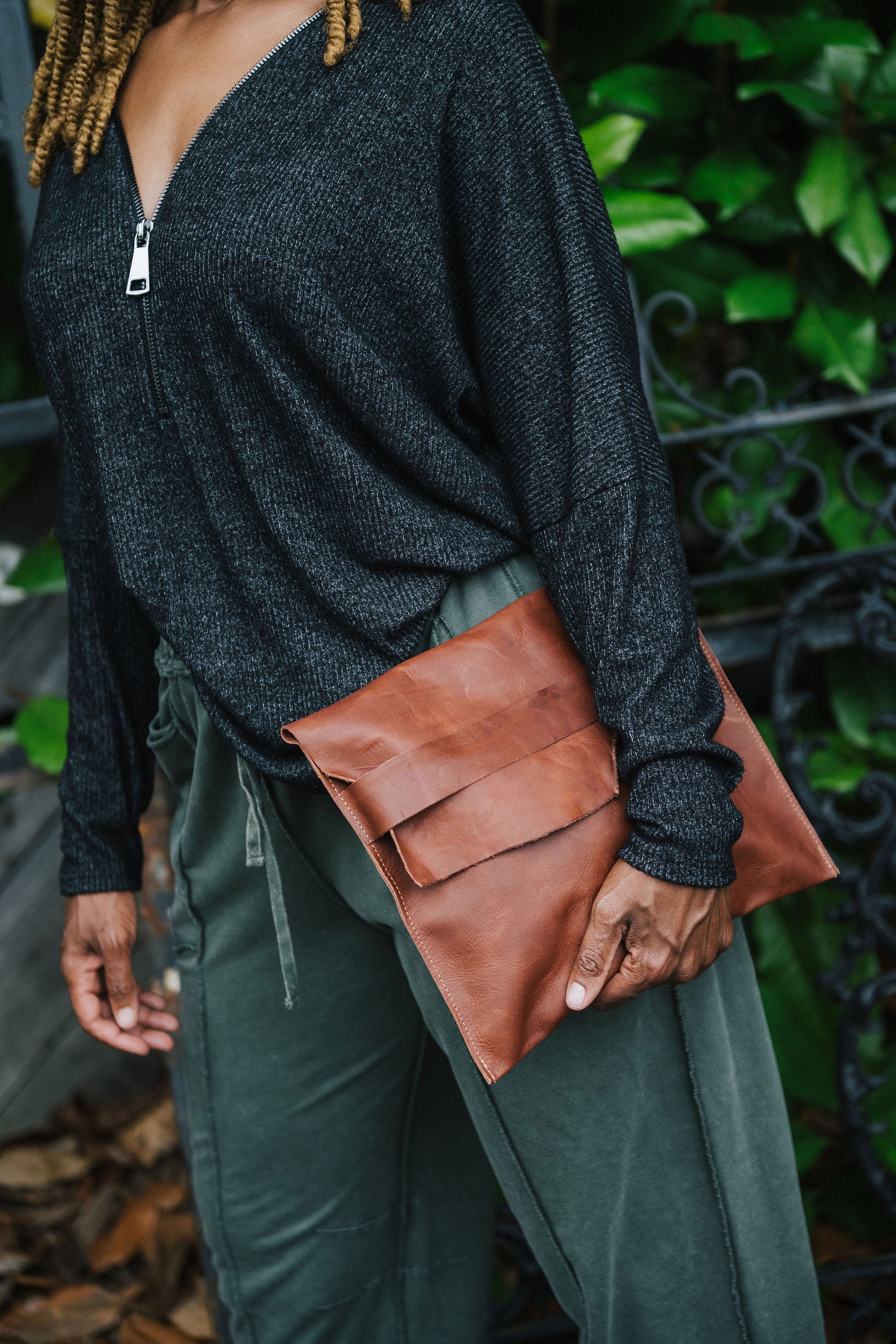Its supple fold-over flap design measures 12 by 13 inches, providing an elegant and practical envelope-style bag ideal for carrying your journal or essentials with refined ease.
