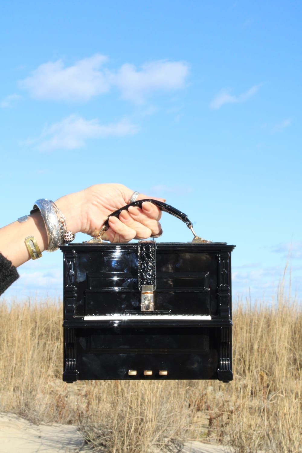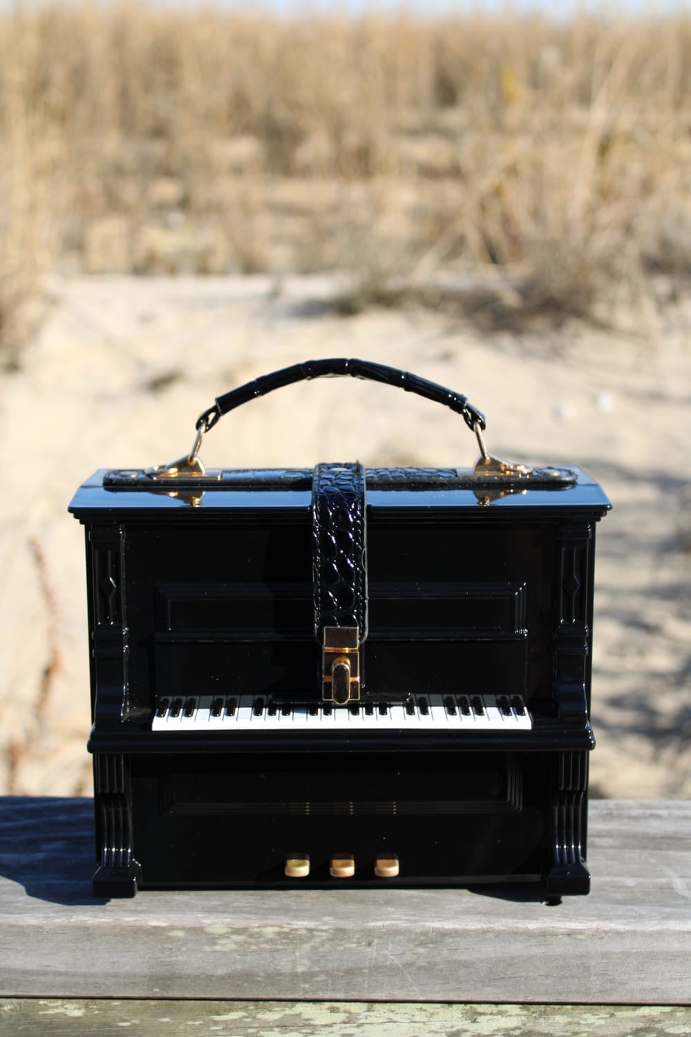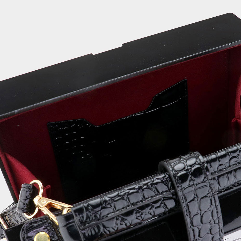 The Piano Bar Bag in Black offers a sleek, compact design measuring 8.5" x 6.5" x 3.5". It features a 1.5" top handle for easy carrying and a 52" adjustable, detachable strap for versatile wear.