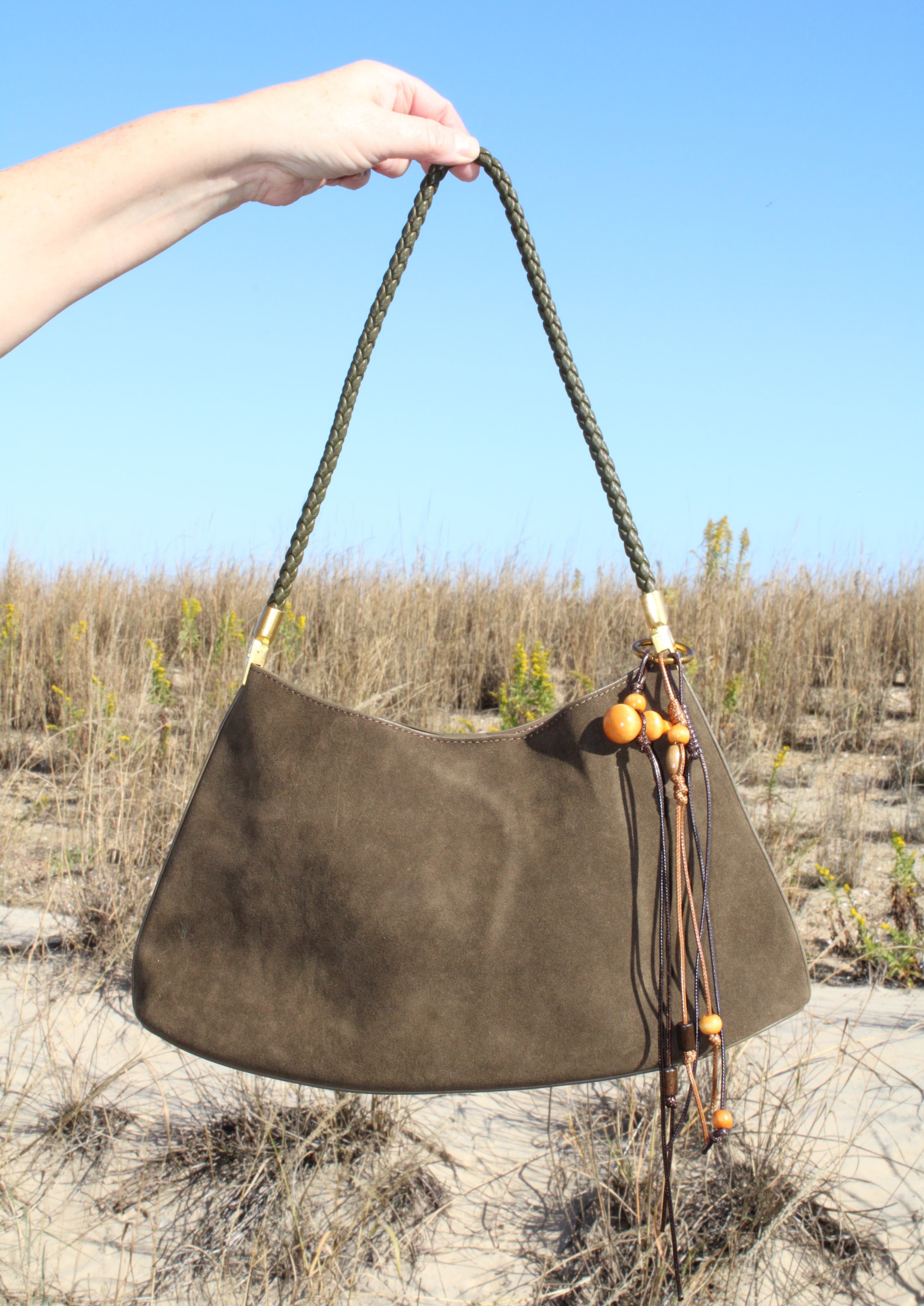 The Salvatore Satchel Bag combines understated elegance with bohemian flair. Crafted from soft faux suede and accented with decorative beads and faux leather detailing, this compact satchel delivers effortless style. Measuring approximately 10" long by 9" high, it fits perfectly under the arm for convenient everyday carry.