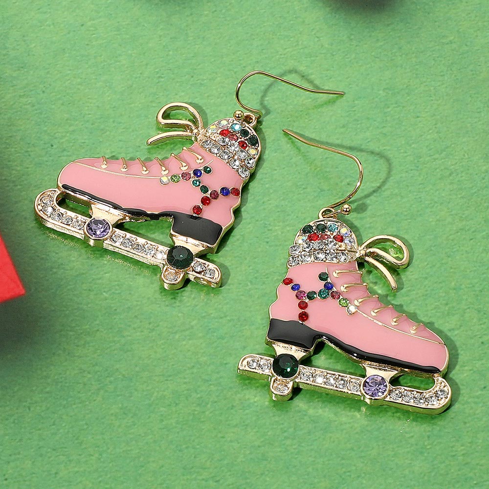• Glide into festive fun with these pink ice skate earrings, featuring sparkling multicolor crystals, enamel detailing, and a glittery blade design. Perfect for winter outfits, holiday parties, or as a playful seasonal gift.