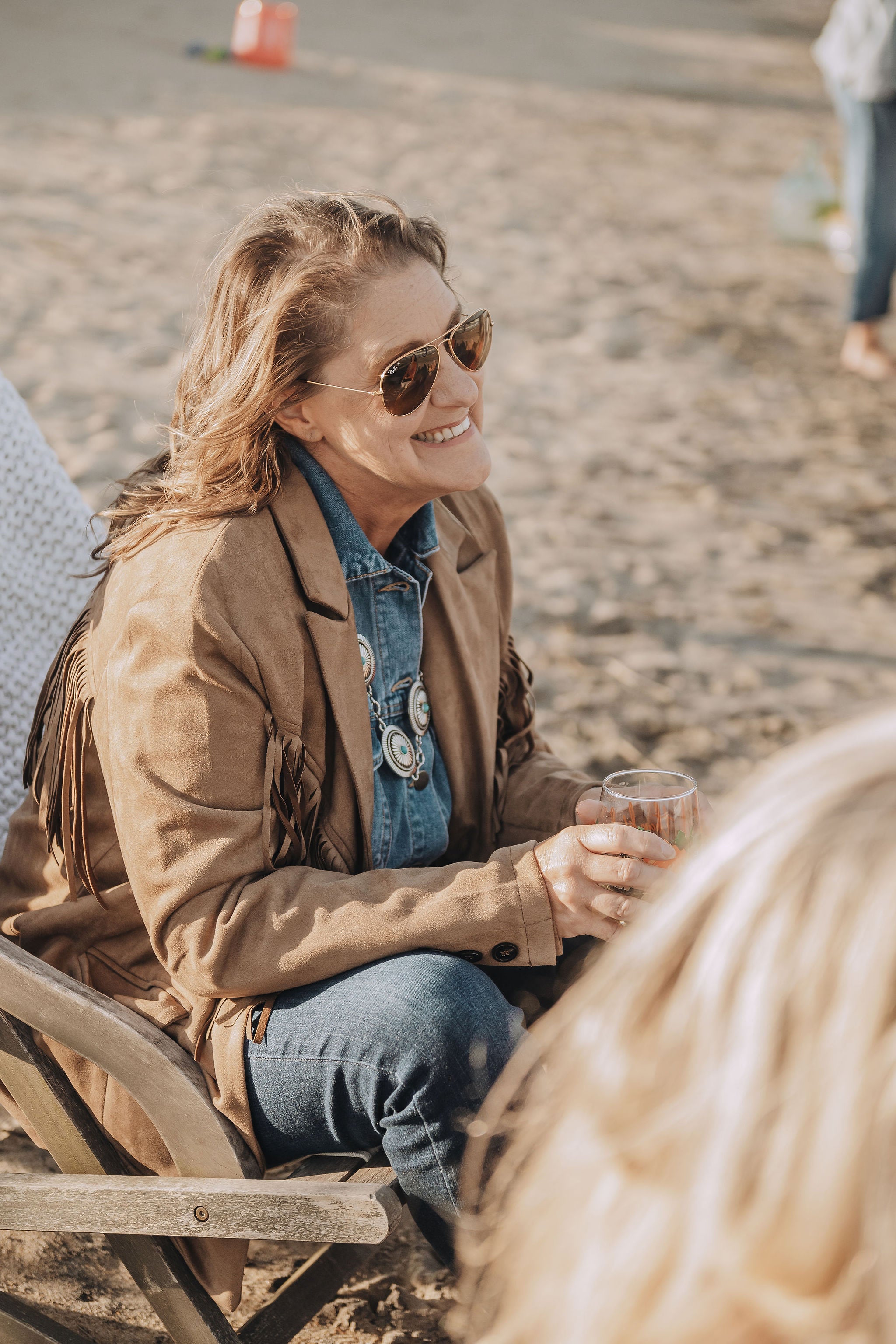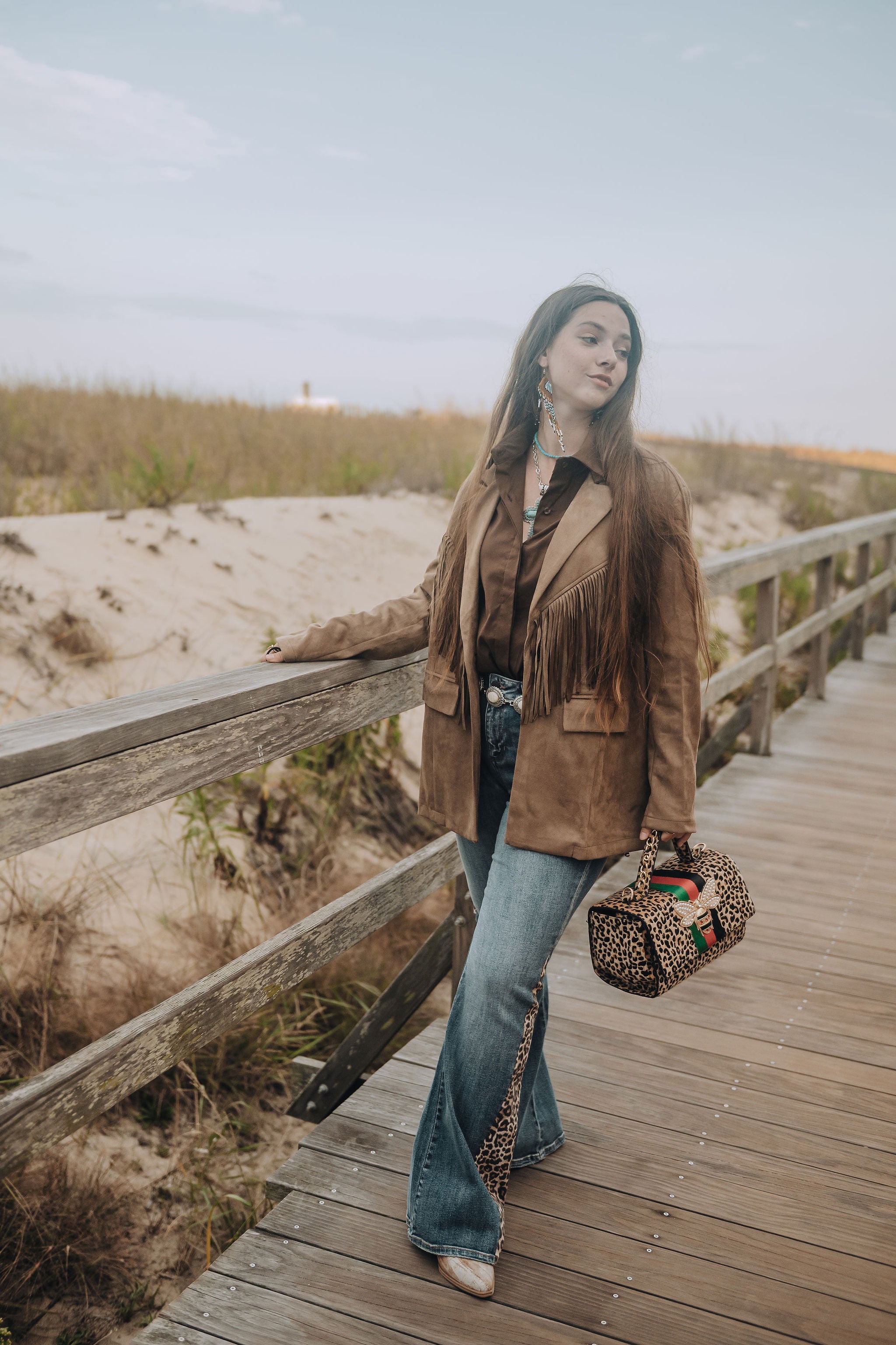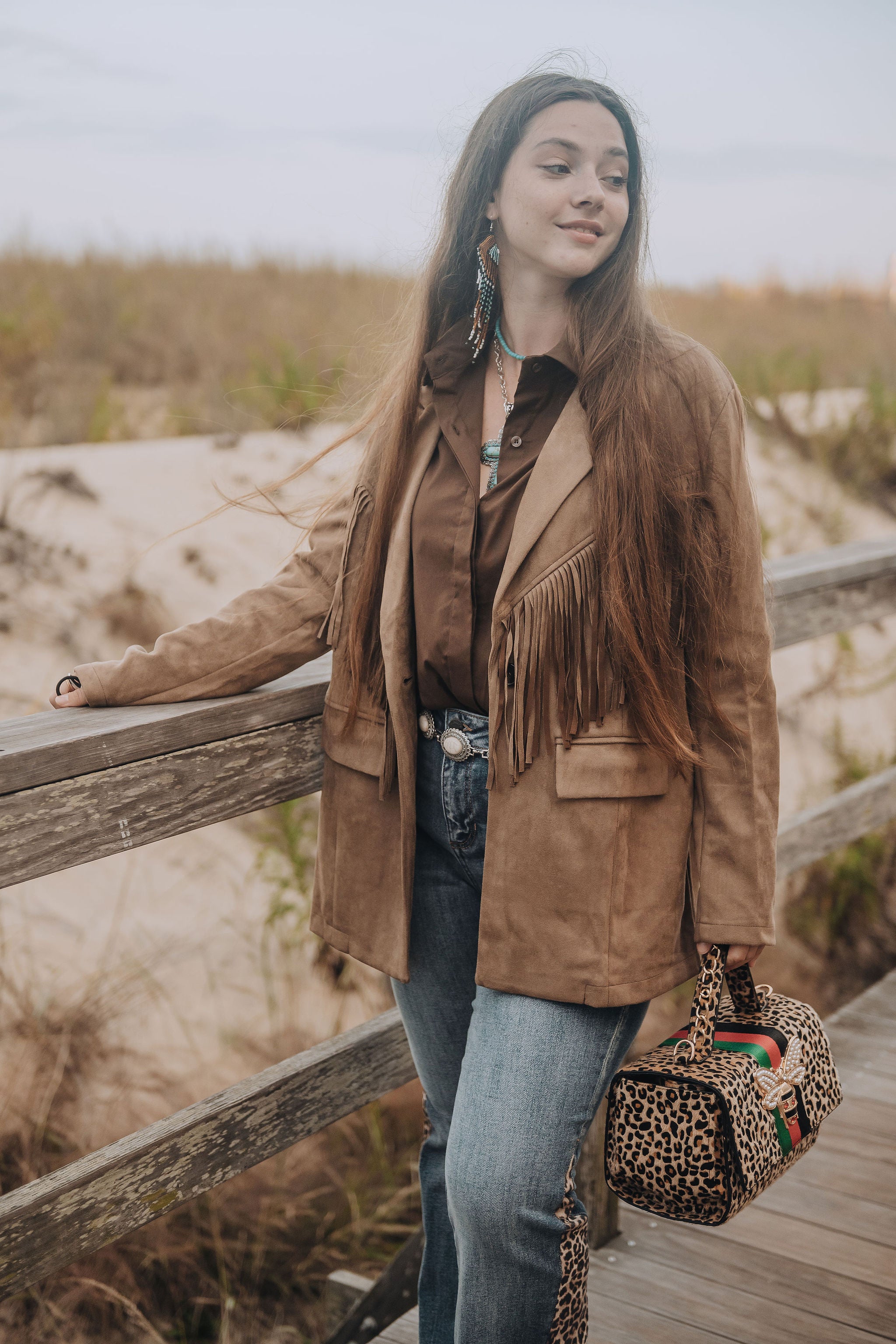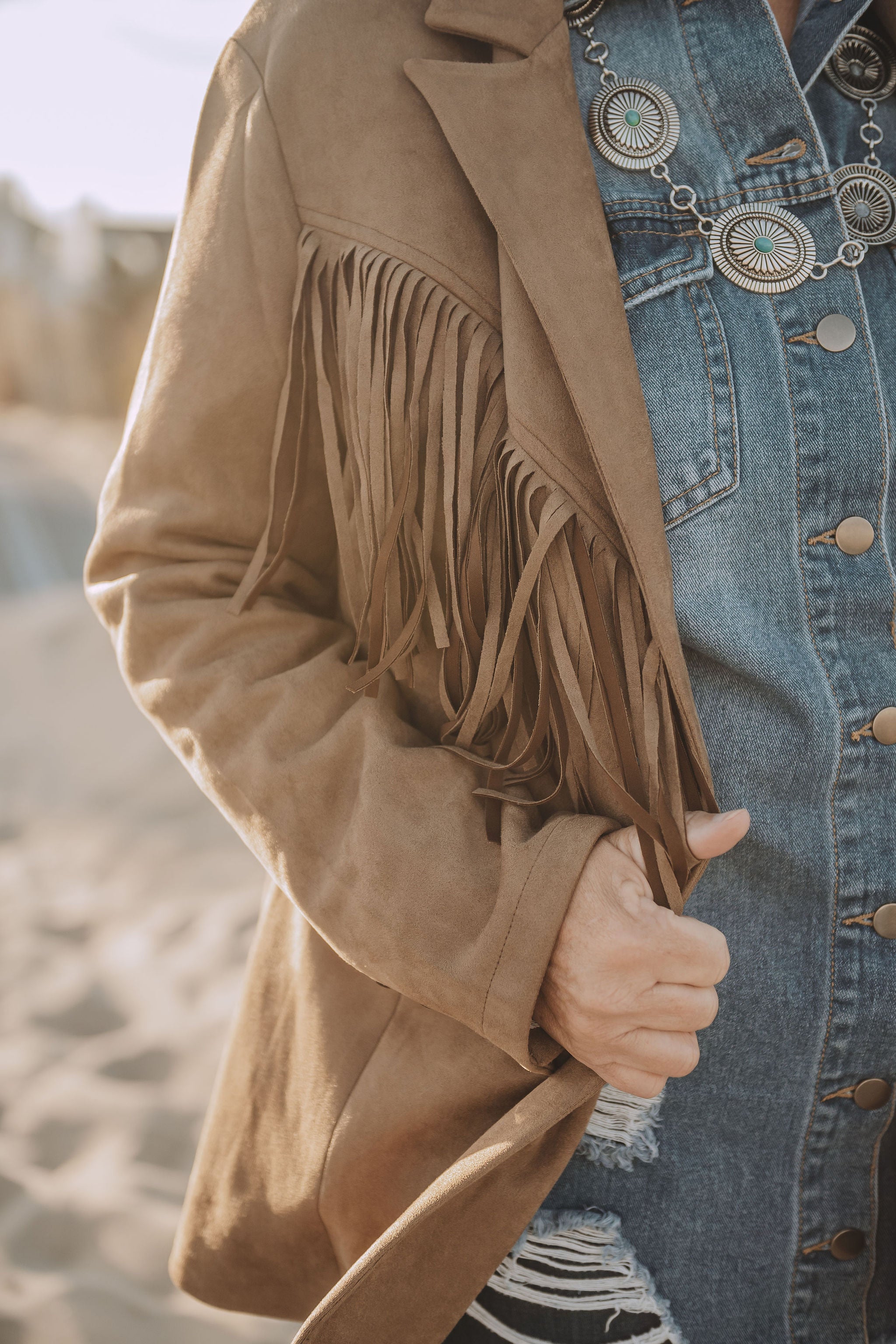 Experience comfort and style with the Desert Fringe Jacket in Taupe.