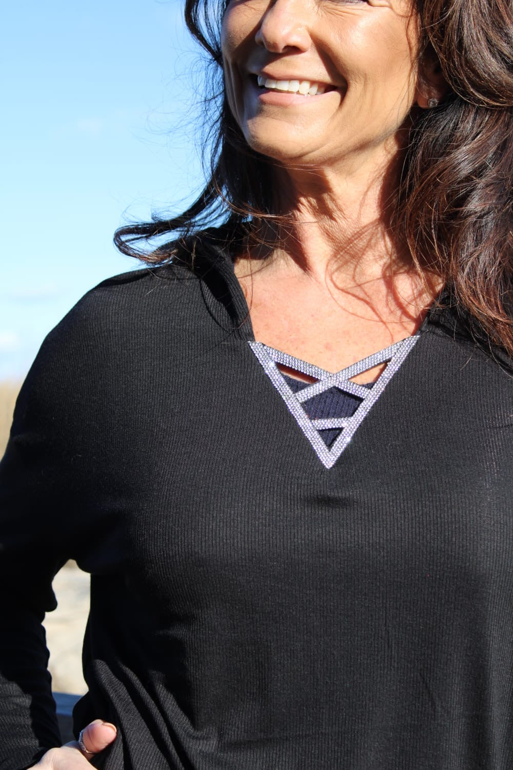 - LONG SLEEVE HOODED TOP FEATURING A SPARKLING CRISS-CROSS DETAIL AT THE V-NECKLINE. DESIGNED WITH A RELAXED FIT AND CURVED HEM FOR A FLATTERING, CASUAL LOOK.