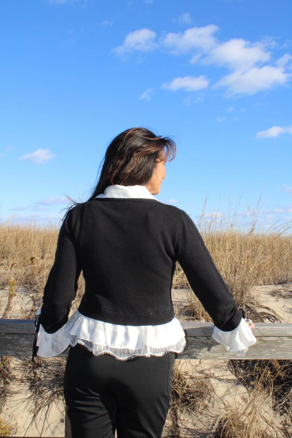 This two-in-one design features dramatic ruffled sleeves that command attention while remaining polished enough to layer under a blazer for elevated everyday wear.