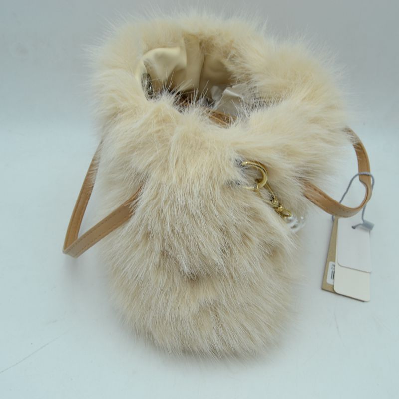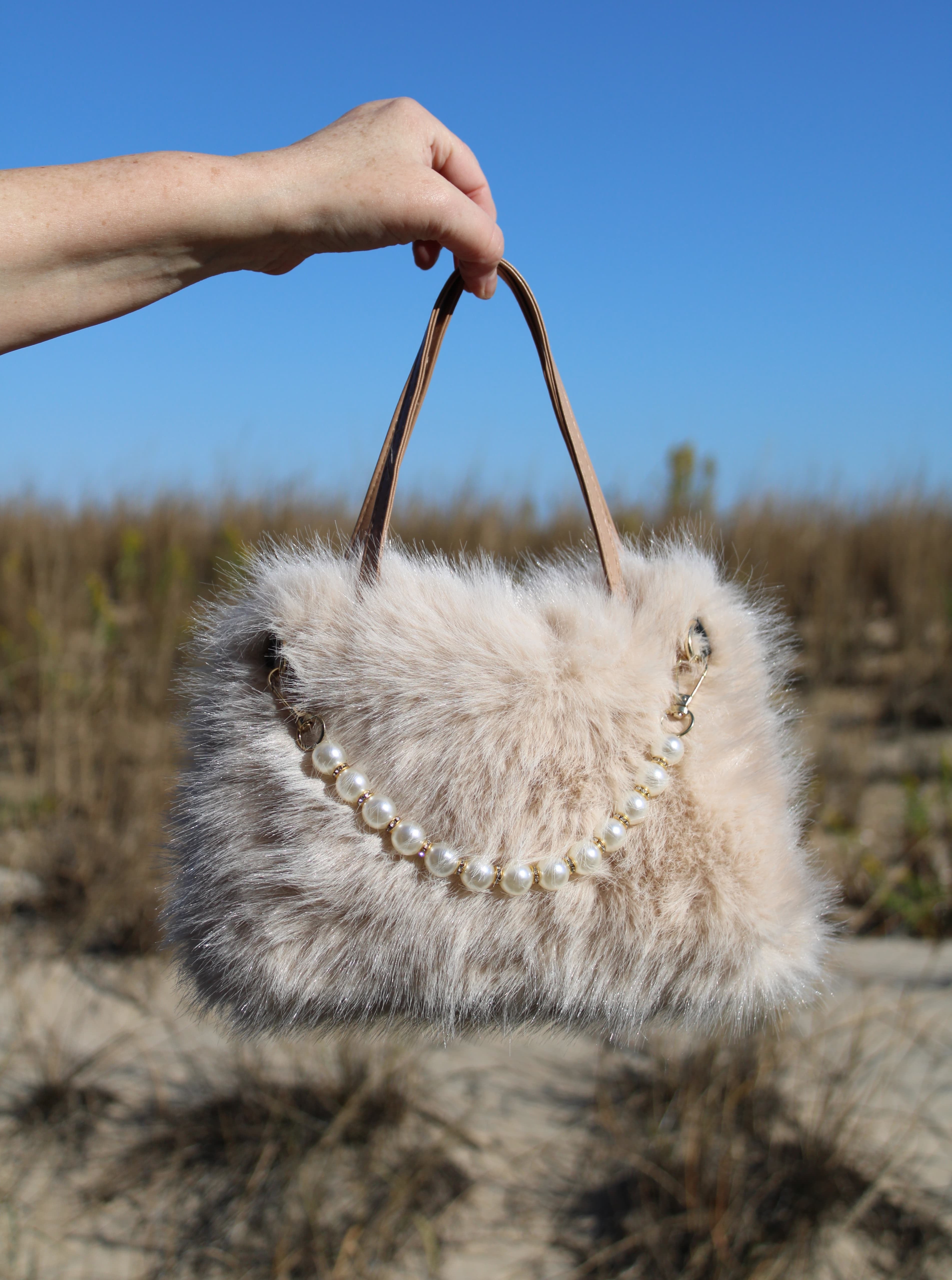 Ms Pearl Faux Fur Bag in Cream combines luxurious faux fur with elegant pearl embellishments for a sophisticated accessory. This 8" x 8" bag features plush, touchably soft material paired with lustrous pearls that elevate any ensemble.