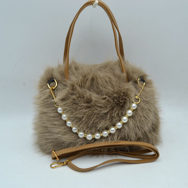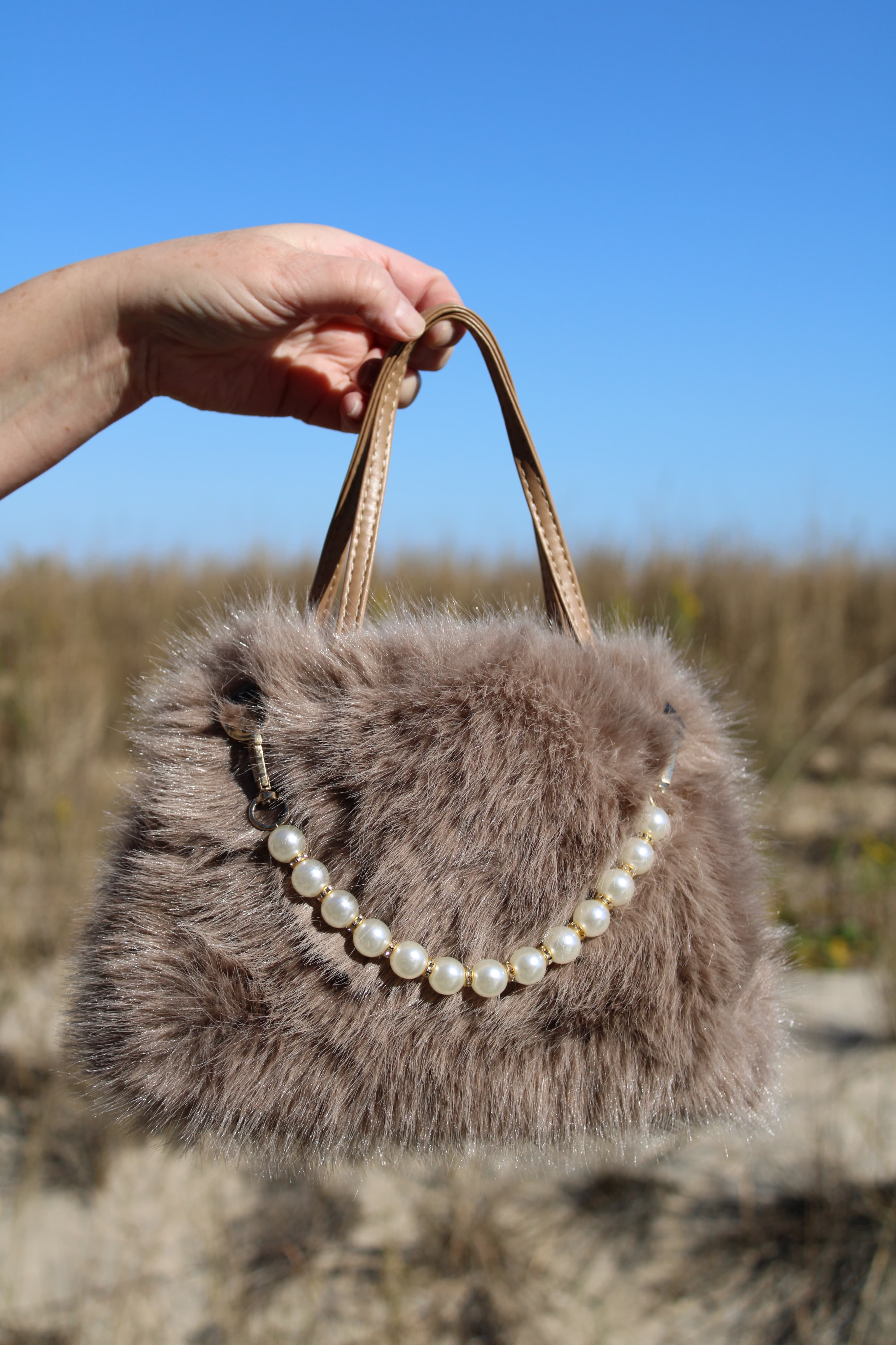 Ms Pearl Faux Fur Bag in Tan combines luxurious faux fur with elegant pearl embellishments for a sophisticated accessory. This 8" x 8" bag features plush, touchably soft material paired with lustrous pearls that elevate any ensemble.