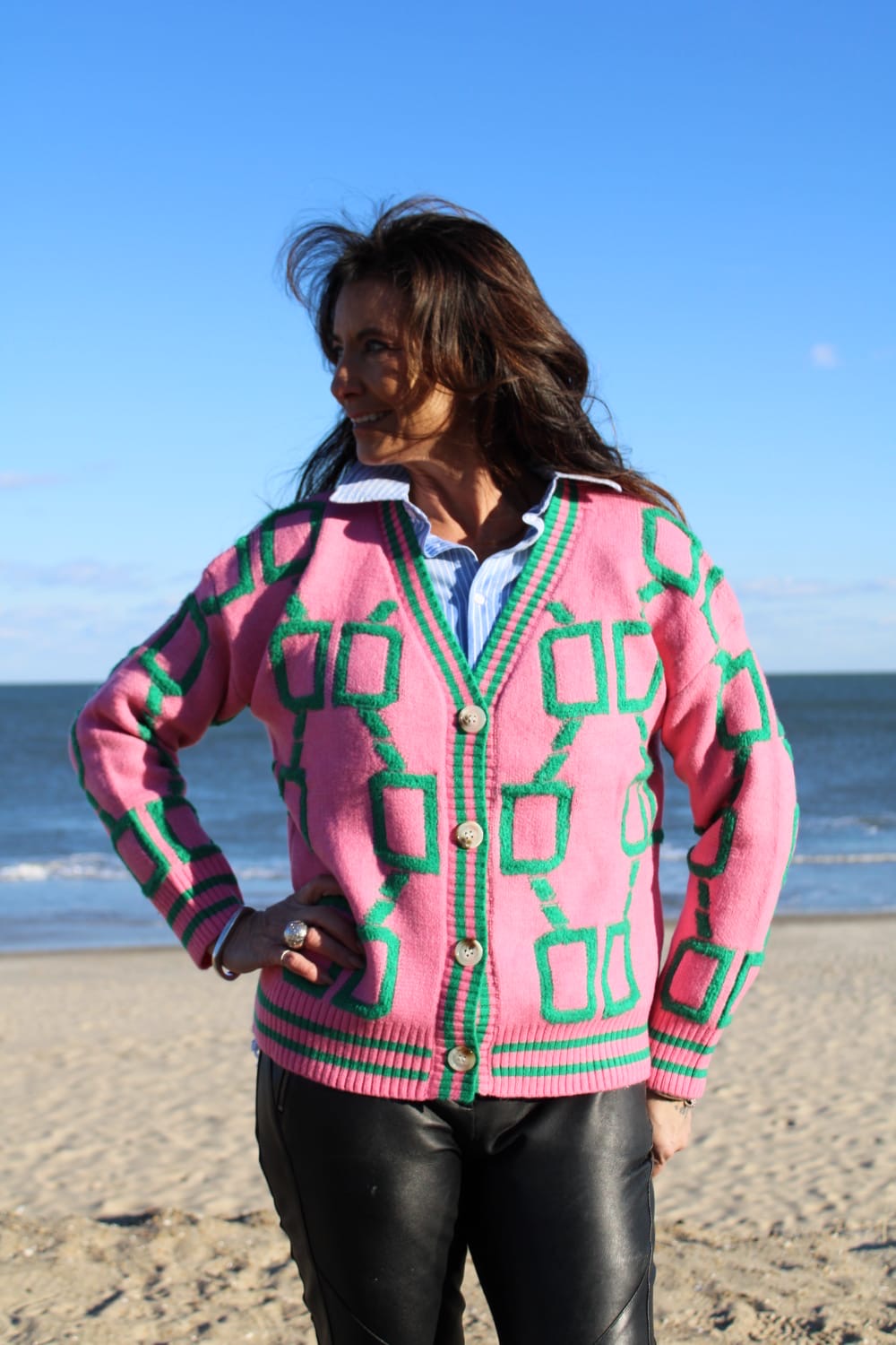 The palette of soft greens and pinks evokes the serene hues of Montauk's shoreline, making it the perfect layering piece to pair with your favorite beach-inspired tops. Whether worn over a classic boyfriend tee or styled solo, this sweater delivers understated luxury with every wear.