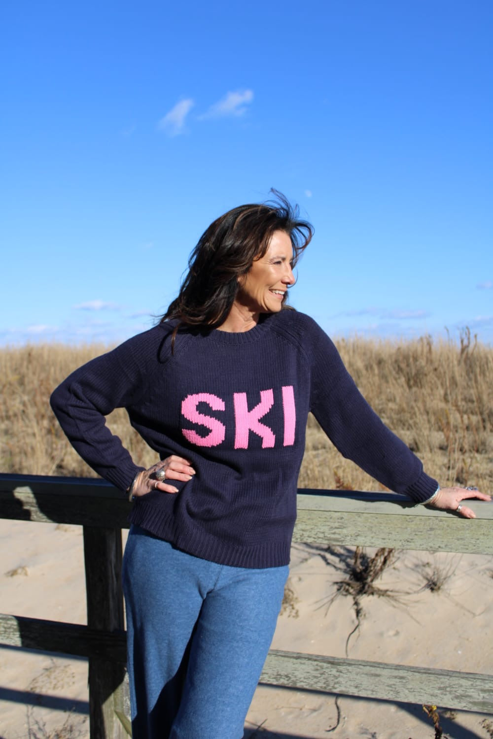 Hit the slopes in style with this playful ski sweater that brings humor and warmth to your winter wardrobe. The navy base pairs perfectly with bold pink lettering for a statement look that stands out on any mountain.