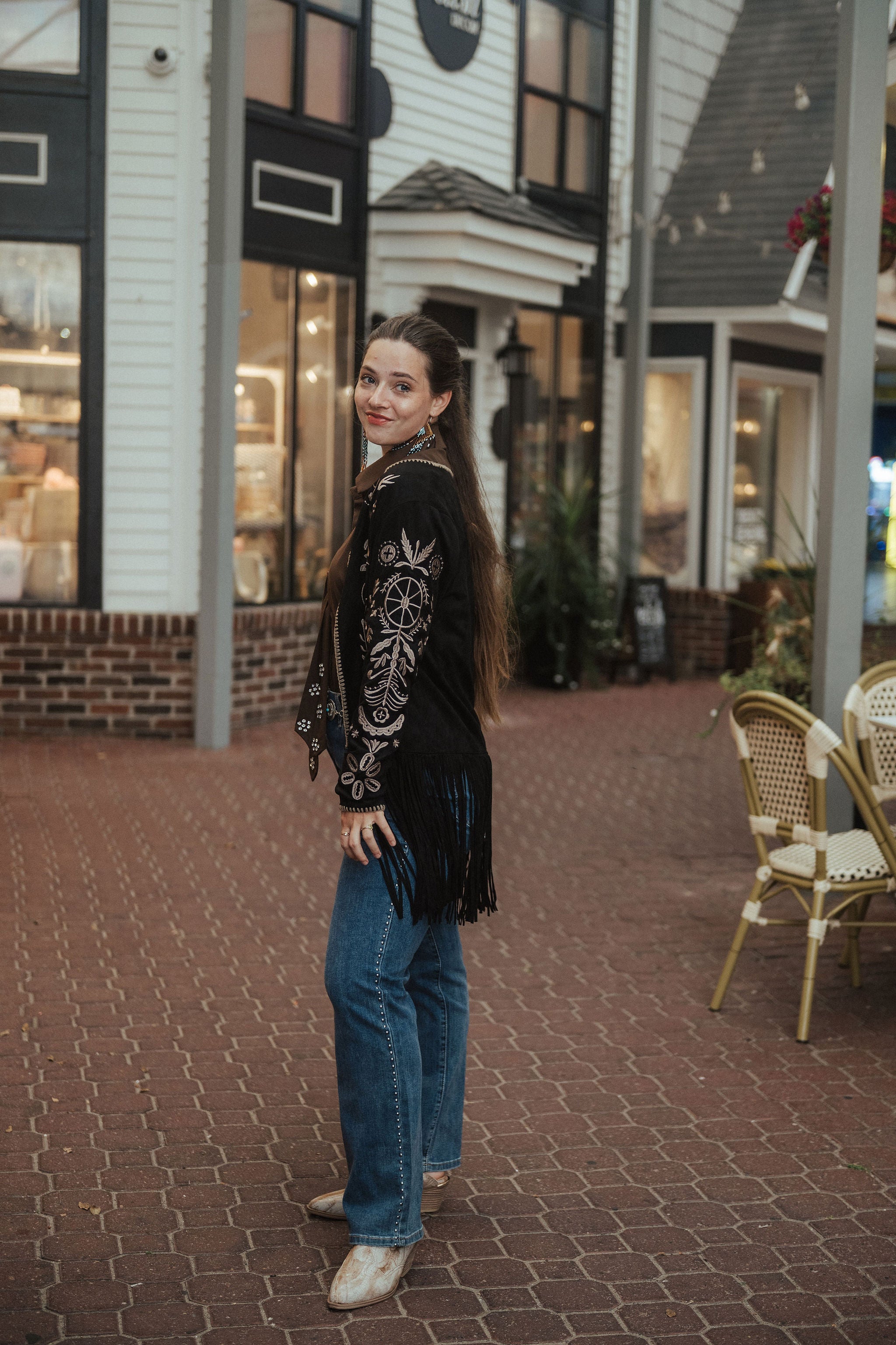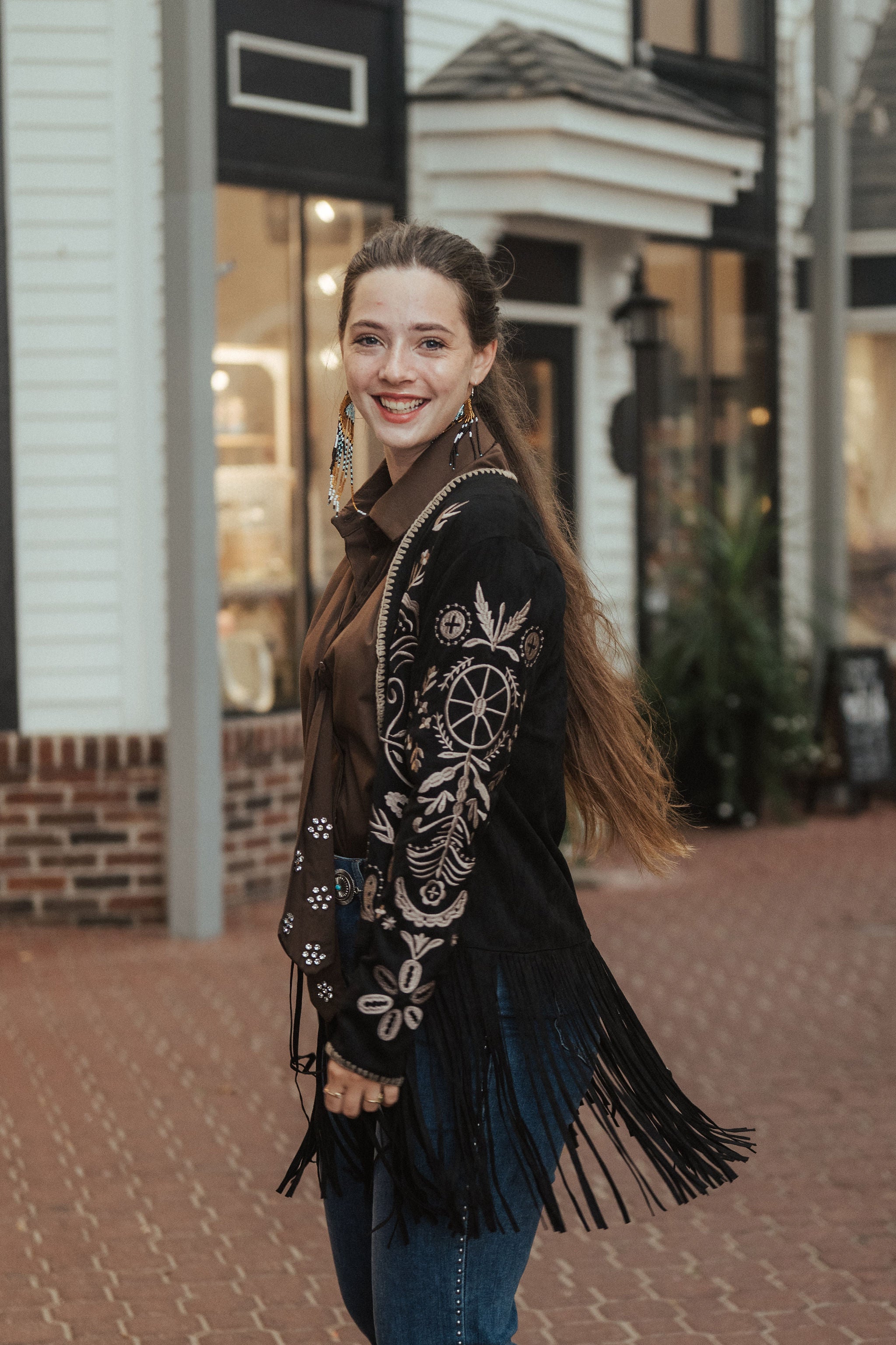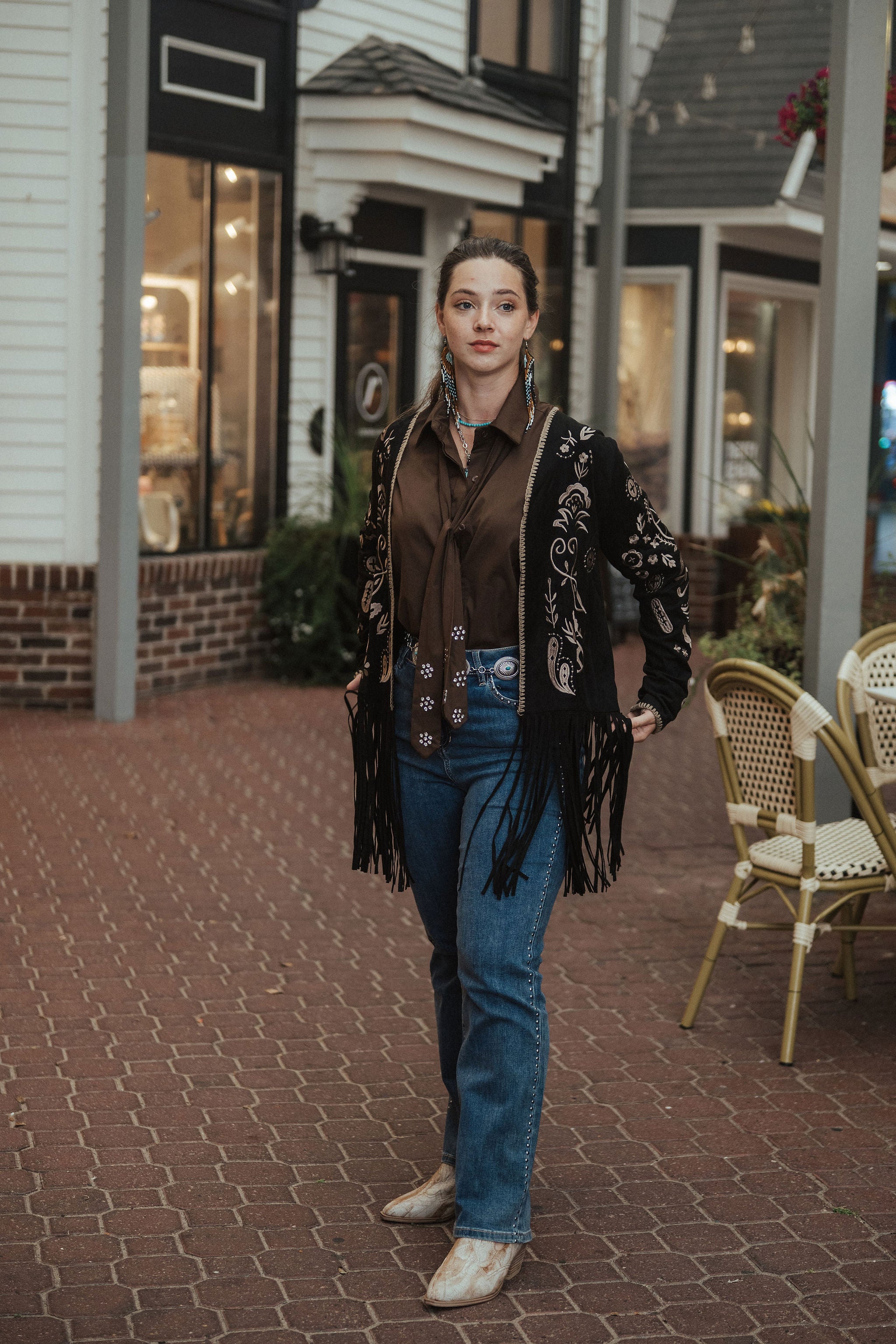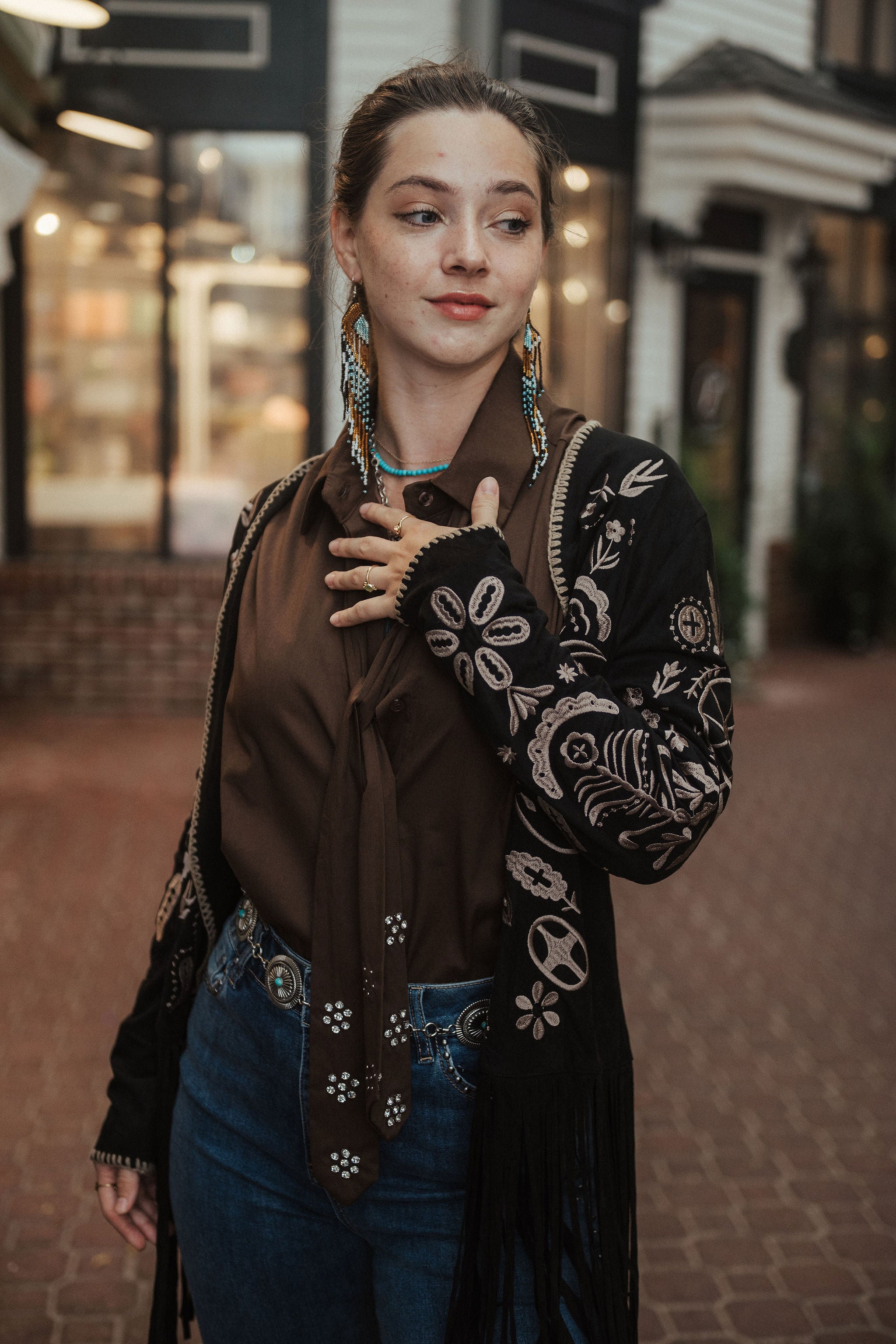 perfect for adding a refined western-inspired touch to your wardrobe. Modeled here by Anna, who is 5'9" and wears a size Medium.