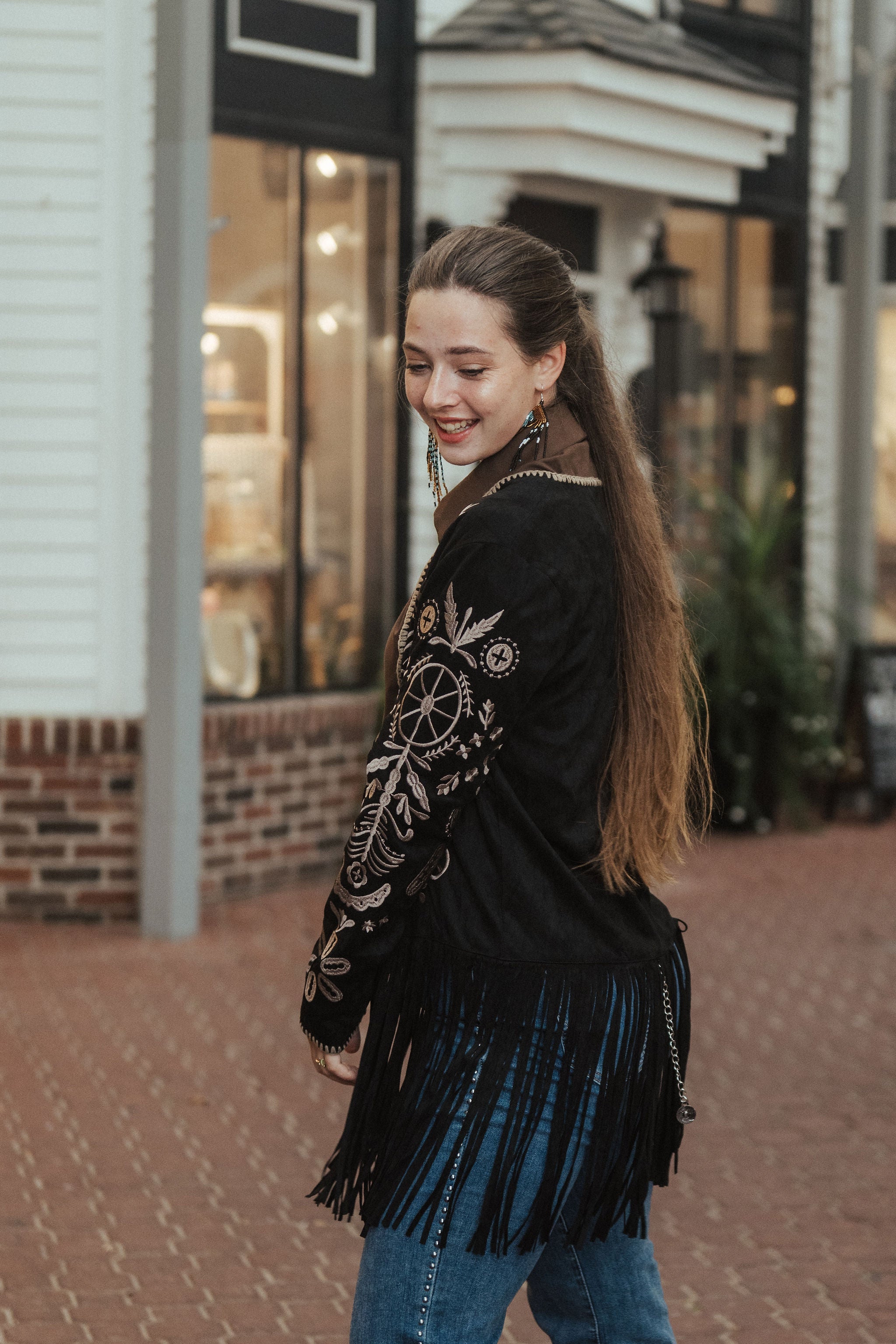 The Prairie Smoke Faux Suede Coat features luxurious fringe accents with intricate heavy embroidery on the front and sleeves, creating a statement piece with artisanal detail. Crafted from a stretchy, soft material,