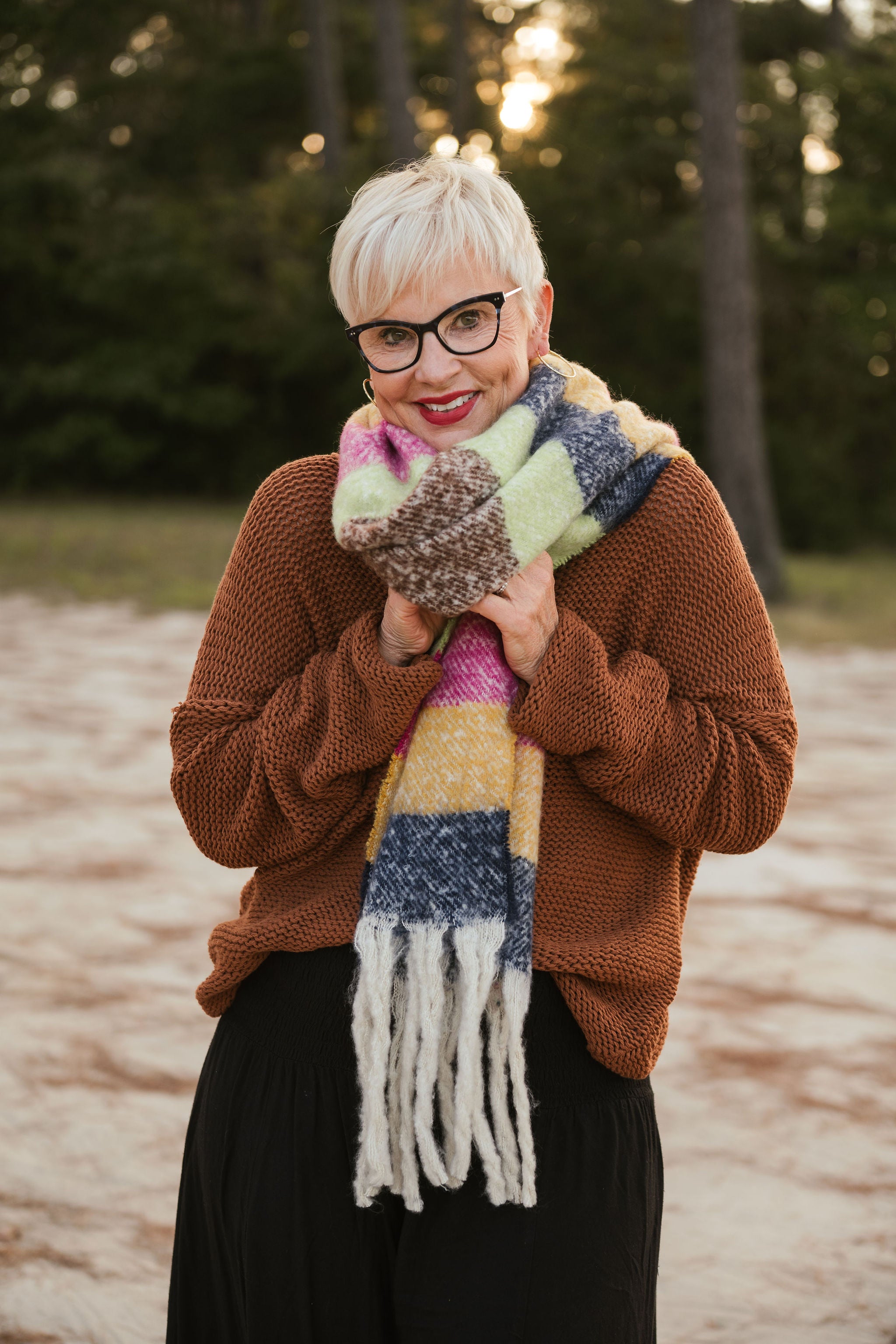 • Add a splash of playful style to your cold-weather wardrobe with this striped oversized knit scarf. Featuring a plush, brushed texture and generous length, it offers both warmth and vibrant appeal. Perfect for layering over any outfit for a cozy yet eye-catching statement.