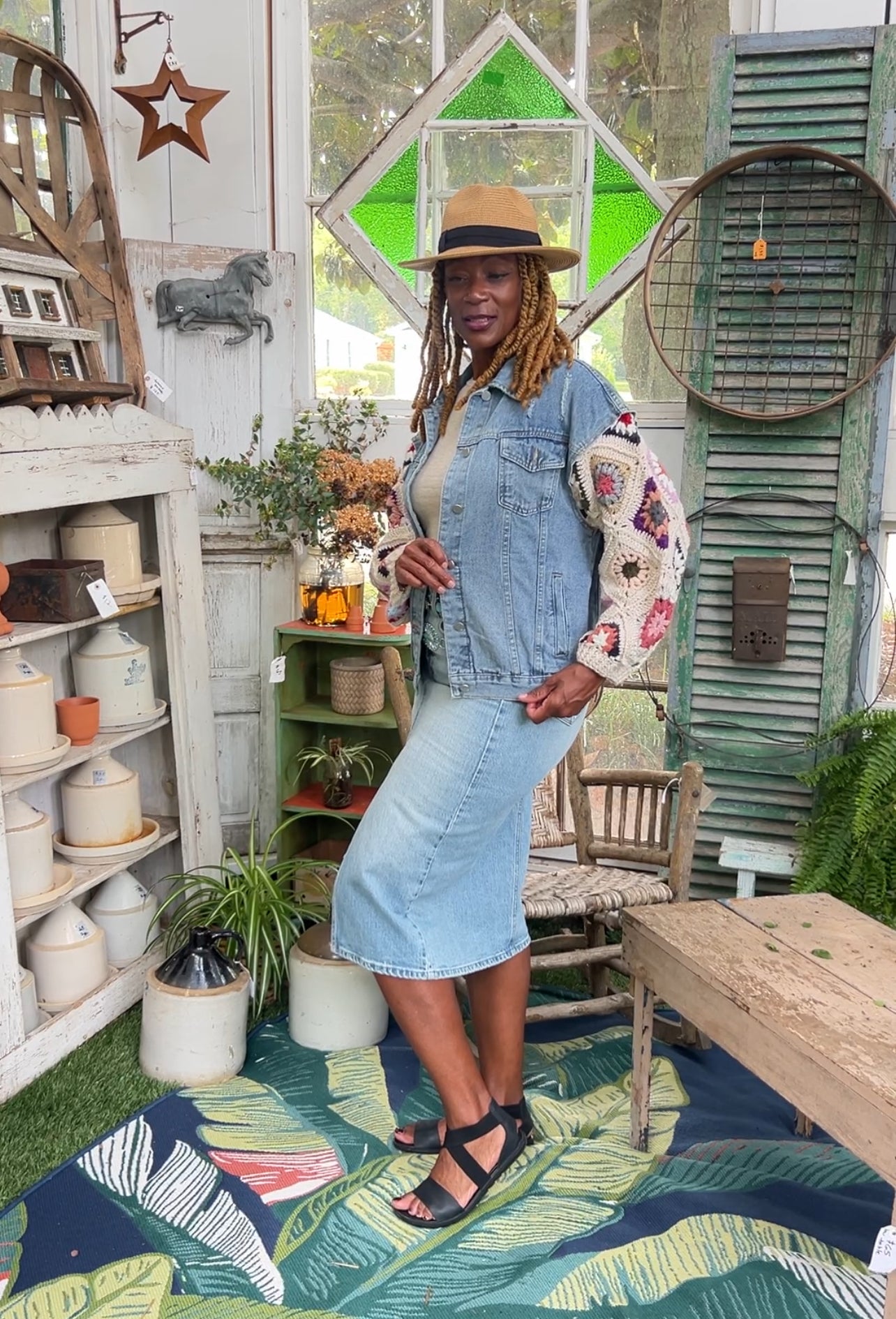 DENIM JACKET DIAMOND FLOWER GRANNY SQUARE HANDMADE CROCHET SLEEVES COQUETTE 55% COTTON 38% POLYESTER 7% ACRYLIC -