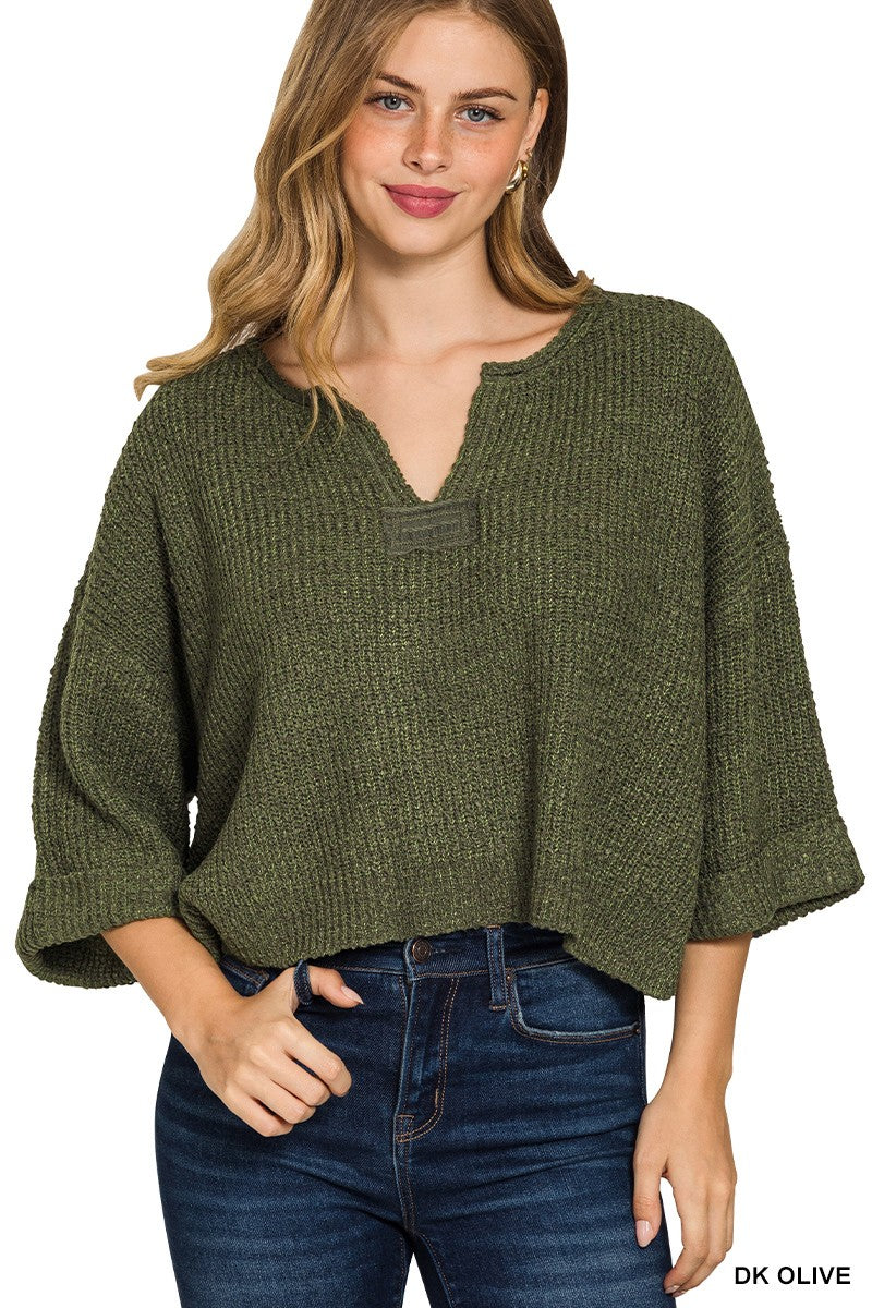 The Sarafina Pullover Sweater Olive features a super soft chenille fabric that offers exceptional comfort.