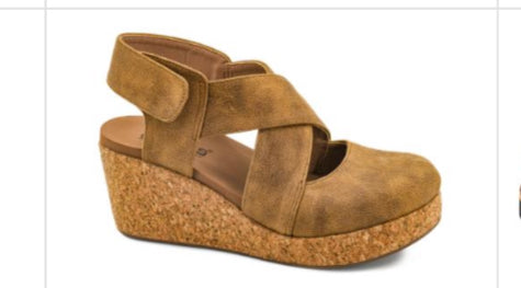 - Synthetic cross-strap upper with a closed toe