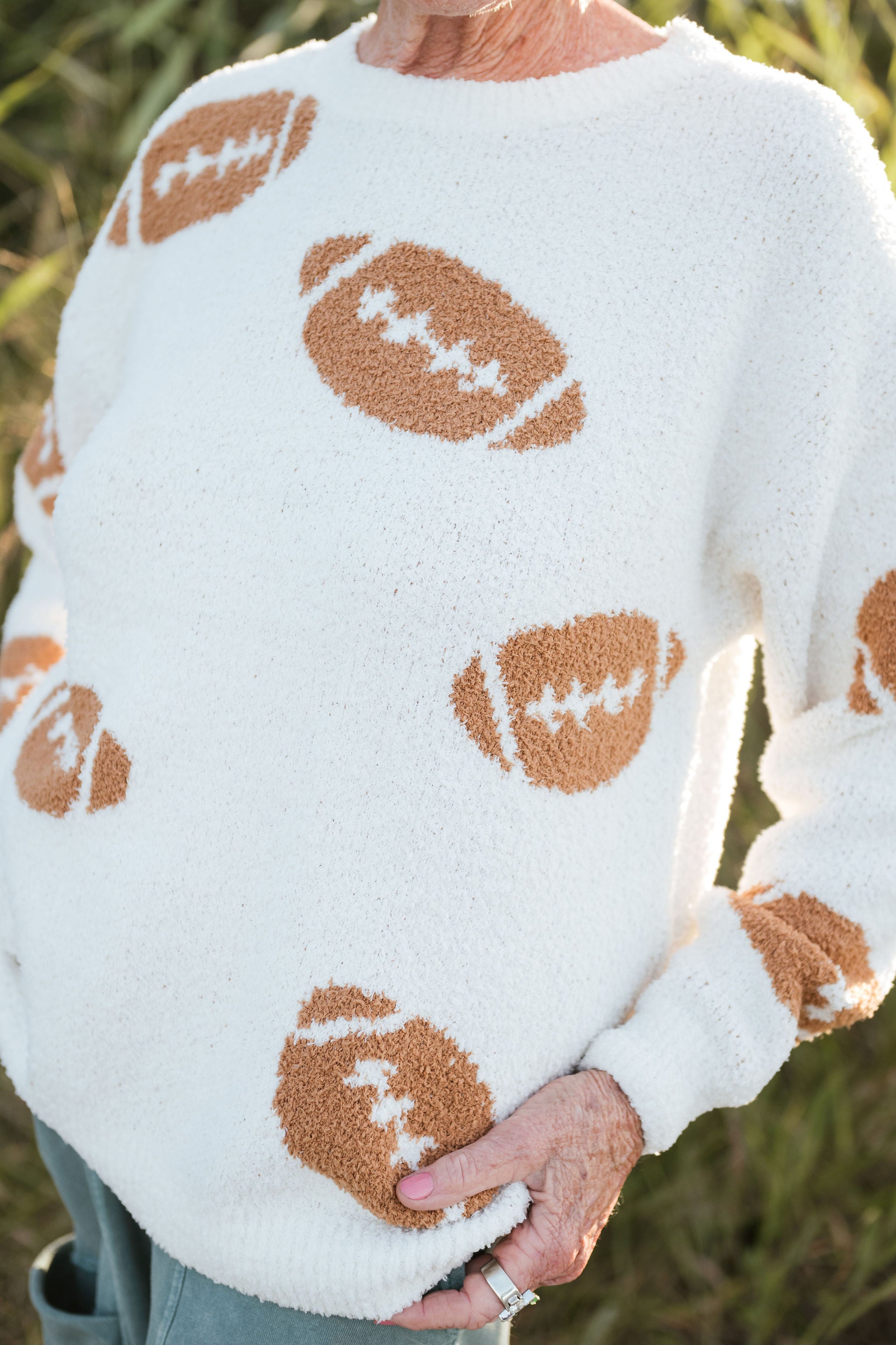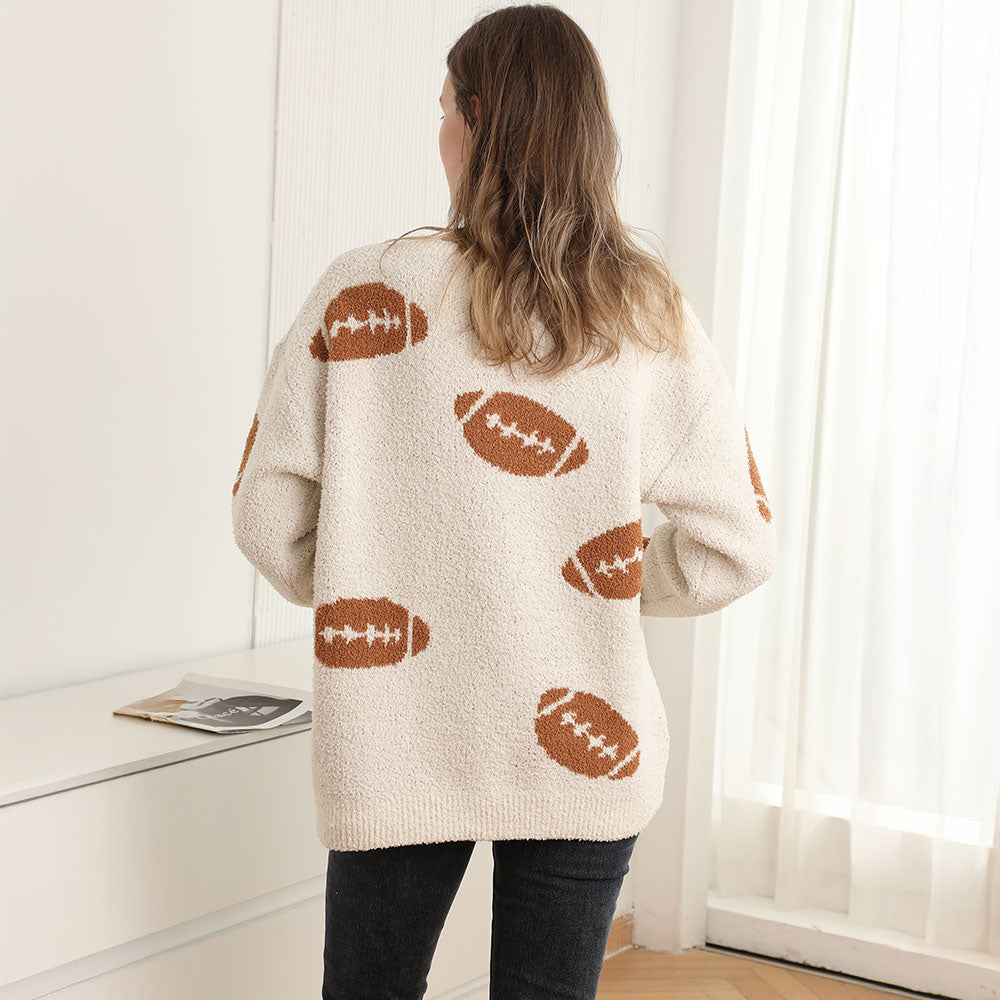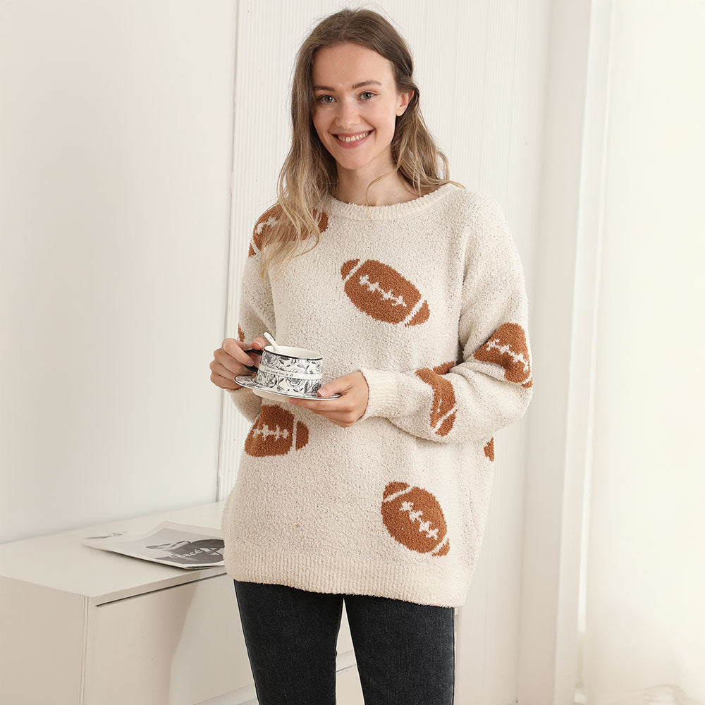 • Stay cozy and stylish with this football-pattern knit sweater, perfect for casual wear or game-day looks. Its relaxed fit, soft texture, and playful sporty design make it a versatile favorite for everyday comfort and style.
