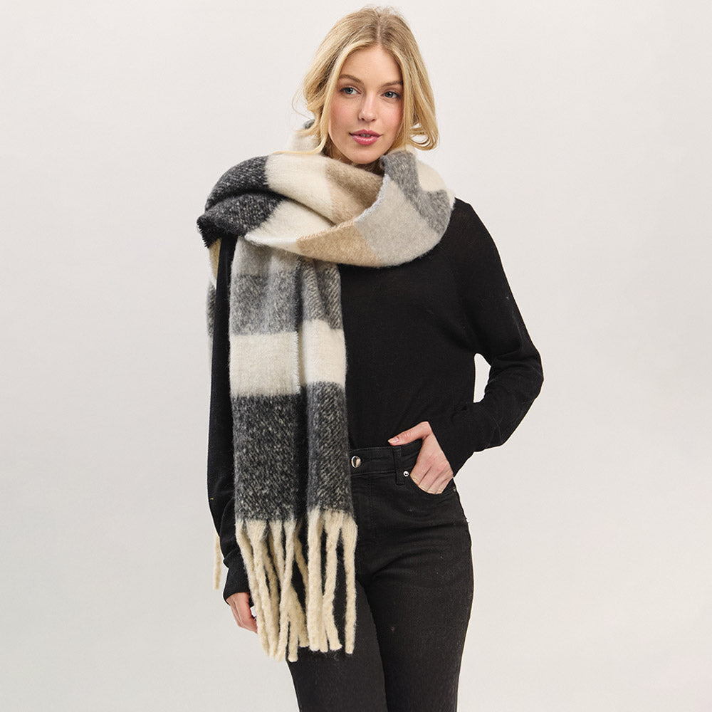 • Oversized plaid scarf with soft, cozy texture and long fringe detailing. Perfect for layering, this stylish accessory provides warmth and a bold statement look for casual outings, seasonal transitions, and cool-weather adventures.