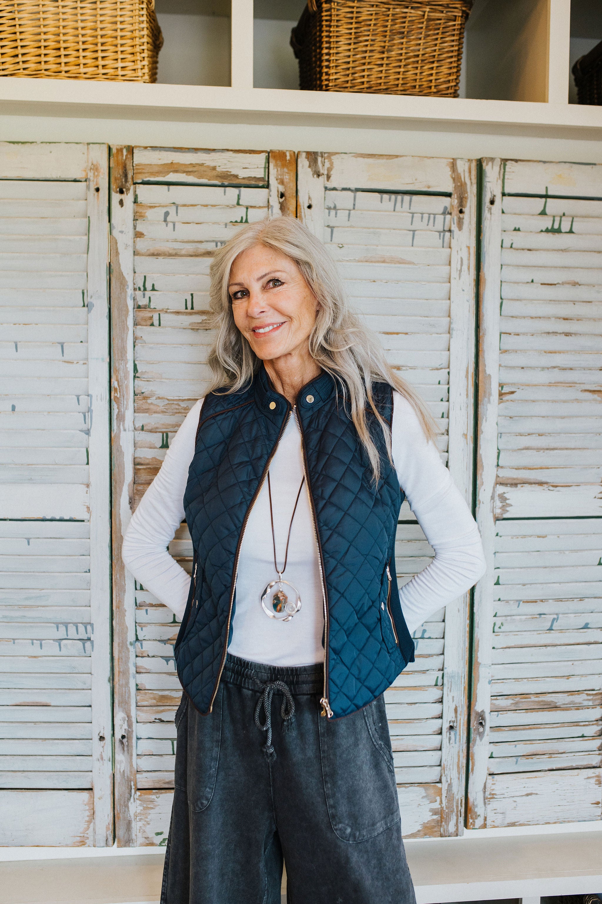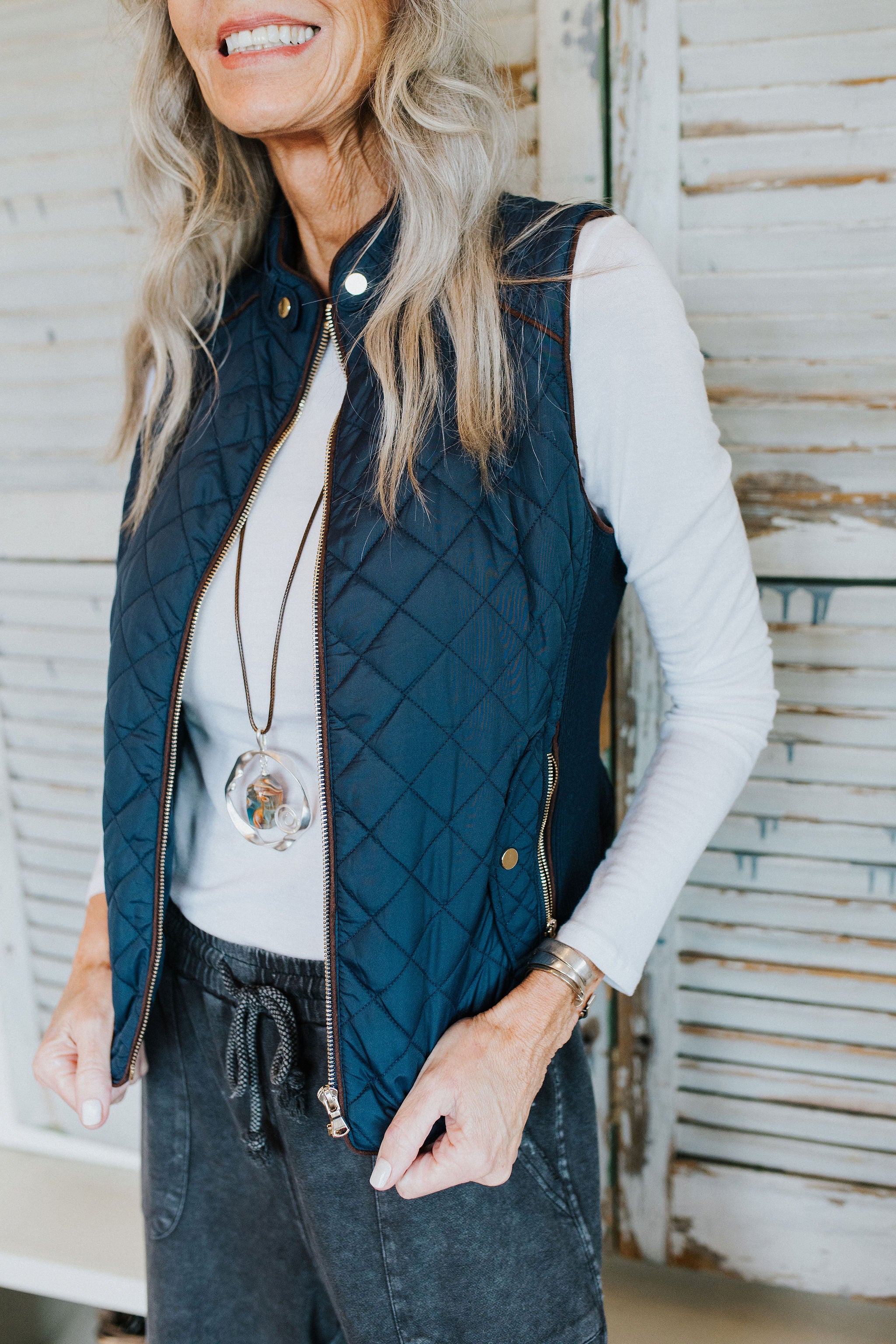 This vest features suede piping accents and a front pocket, complemented by ribbed sides and quilted padding. Designed with a snug fit, we recommend sizing up.